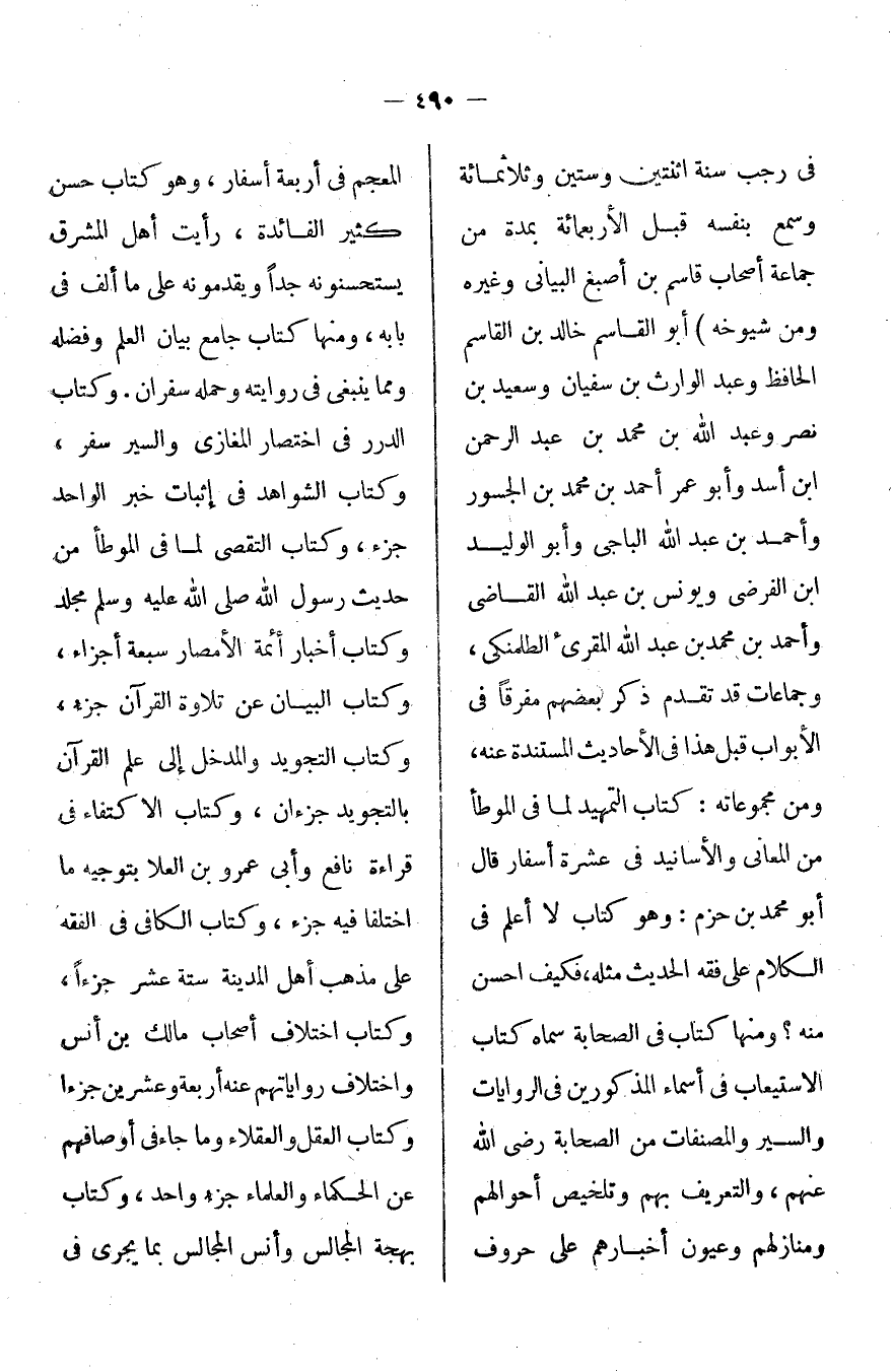 في رجب سنة اثنتين وستين وثلاثمائة وسمع بنفسه قبل الأربعمائة بمدة من جماعة أصحاب قاسم بن أصبغ البياني وغيره [ومن شيوخه] أبو القاسم خالد بن القاسم الحافظ وعبد الوارث بن سفيان وسعيد بن نصر وعبد الله بن محمد بن عبد الرحمن بن أسد وأبو عمر أحمد بن محمد بن الجسور وأحمد بن عبد الله بالباجي وأبو الوليد بن الفرضي ويونس بن عبد الله القاضي وأحمد بن محمد بن عبد الله المقرئ الطلمنكي، وجماعت قد تقدم ذكر بعضهم مفرقاً في الأبواب قبل هذا في الأحاديث المسندة عنه، ومن مجموعاته: كتاب "التمهيد لما في الموطأ من المعاني والأسانيد" في عشرة أسفار، قال أبو محمد بن حزم: وهو كتاب لا أعلم في الكلام على فقه الحديث مثله، فكيف أحسن منه؟ ومنها كتاب في الصحابة سماه كتاب "الاستيعاب في أسماء المذكورين في الروايات والسير والمصنفات من الصحابة رضي الله عنهم، والتعريف بهم وتلخيص أحوالهم ومنازلهم وعيون أخبارهم على حروف المعجم" في أربعة أسفار، وهو كتاب حسن كثير الفائدة، رأيت أهل المشرق يستحسنونه جداً ويقدمونه على ما ألف في بابه، ومنها كتاب "جامع بيان العلم وفضله ومما ينبغي في روايته وحمله" سفران، وكتاب "الدرر في اختصار المغازي والسير" سفر، وكتاب "الشواهد في إثبات خبر الواحد"، وكتاب "التقصي لما في الموطأ من حديث رسول الله (صلى الله عليه وآله وسلم) " مجلد وكتاب "أخبار أئمة الأمصار" سبعة أجزاء، وكتاب "البيان عن تلاوة القرآن" جزء، وكتاب "التجويد والمدخل إلى علم القرآن بالتجويد" جزءان وكتاب "الاكتفاء في قراءة نافع وأبي عمرو بن العلا بتوجيه ما اختلفا فيه" جزء، وكتاب "الكافي في الفقه على مذهب أهل المدينة" ستة عشر جزءاً، وكتاب "اختلاف أصحاب مالك بن أنس واختلاف رواياتهم عنه" أربعة وعشرين جزءاً وكتاب "العقل والعقلاء وما جاء في أوصافهم عن الحكماء والعلماء" جزء واحد، وكتاب "بهجة المجالس وأنس المجالس بما يجري في
