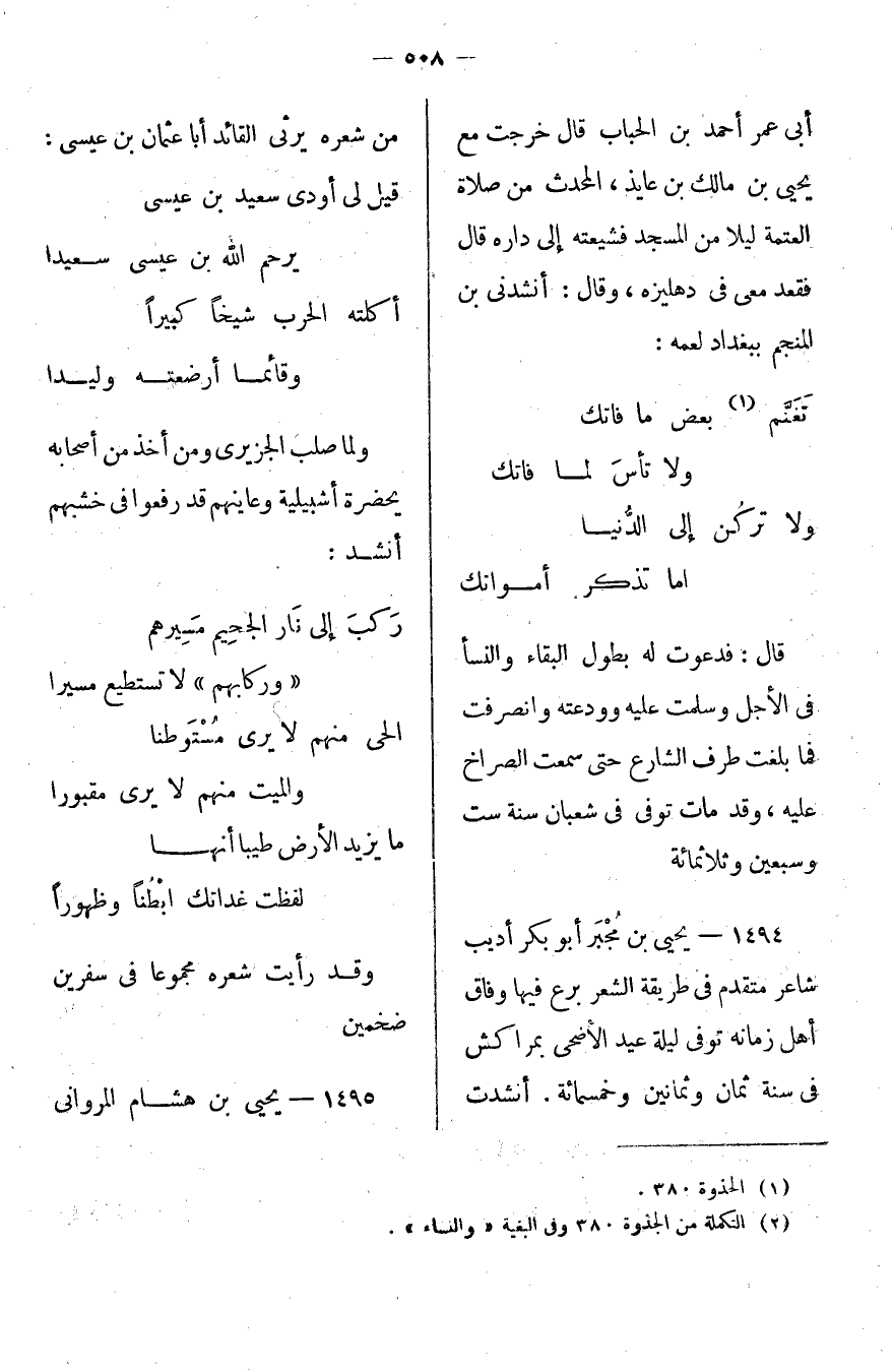 أبي عمر أحمد بن الحباب قال: خرجت مع يحيى بن مالك بن عايذ المحدث من صلاة العتمة ليلاً من المسجد فشيعته إلى داره قال: فقعد معي في دهليزه، وقال: أنشدني بن المنجم ببغداد لعمه: