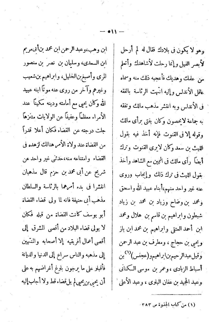 وهو لا يكون في بلادك؟ فقال له: لم أرحل؛ لأبصر الفيل وإنما رحلت لأشاهدك وأتعلم من علمك وهديك فأعجبه ذلك منه وسماع عاقل الأندلس، وإليه انتهت الرئاسة بالفقه في الأندلس وبه انتشر مذهب مالك وتفقه به جماعة لا يحصون وكان يفتى برأي مالك وقوله، إلا في القنون فإن أخذ فيه بقول الليث بن سعد، وكان لا يرى القنوت وترك أيضاً رأى مالك في اليمين مع الشاهد، وأخذ يقول الليث في ترك ذلك وإيجاب، وروى عن غير واحد منهم ابناه عبيد الله وإسحق ومحمد بن وضاح وزياد بن محمد بن زياد شبطون وإبراهيم بن قاسم بن هلال ومحمد بن أحمد العتقي وإبراهيم بن محمد بن باز ويحيى بن حجاج ومطرف بن عبد الرحمن وقيل عبد الرحيم بن إبراهيم و [عجنس] بن أسباط الزبادي وعمر بن موسى الكناني وعبد المجيد بن عفان البلوي وعبد الأعلى بن وهب وعبد الرحمن بن محمد بن أبي مريم ابن السعدي، وسليمان بن نصر بن منصور المري وأصبغ بن الخليل وإبراهيم بن شعيب وغيرهم، وآخر من روى عنه موتا ابنه عبيد الله وكان يحيى مع إمامته ودينه مكيناً عند الأمراء معظماً وعفيفاً عن الولايات متنزهاً جلت درجته عن القضاءي فكان أعلا قدراً من القضاء عند ولاة الأمر هناك لزهده في القضاء وامتناعه منه، حدثني غير واحد عن شريح من أبي محمد بن حزم قال: مذهبان انتشرا في بدء أمرهما بالرئاسة والسلطان مذهب أبي حنيفة فإنه لما ولي قضاء القضاة أبو يوسف كانت القضاة من قبله فكان لا يولى قضاء البلاد من أقصى المشرق إلى أقصى أعمال أفريقية إلا أصحابه والمنتهين إلى مذهبه والناس سراع إلى الدنيا والديانة فأقبلوا على ما يرجون بلوغ أغراضهم به، على أن يحيى بن يحيى لم يل قضاء قط ولا أجاب إليه