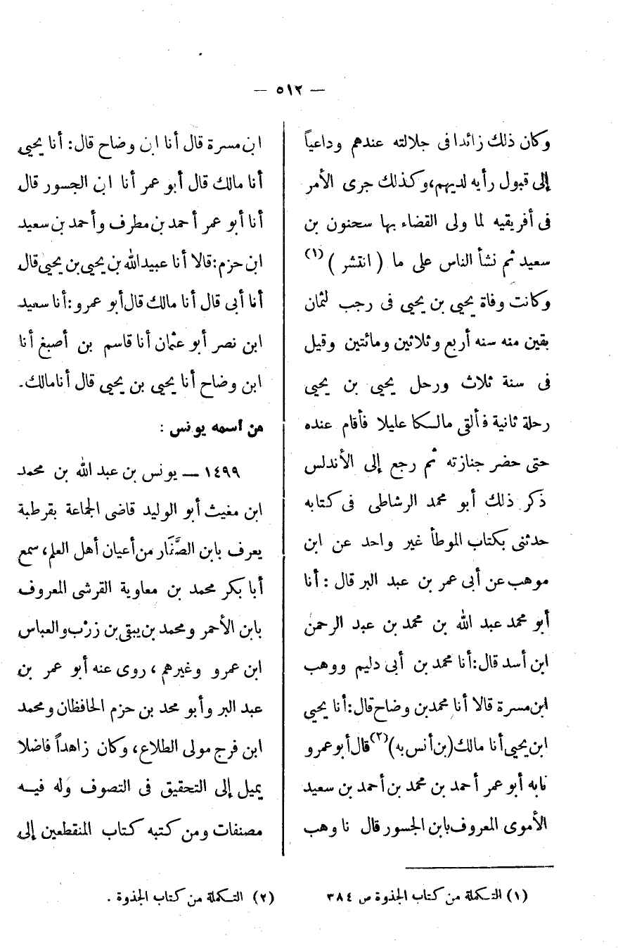وكان ذلك زائداً في جلالته عندهم وداعياً إلى قبول رأيه لديهم، وكذلك جرى الأمر في أفريقية لما ولي القضاء بها سحنون بن سعيد ثم نشأ الناس على ما [انتشر] ، وكانت وفاة يحيى بن يحيى في رجب لثمان بقين منه سنة أربع وثلاثين ومائتين وقيل في سنة ثلاث ورحل يحيى بن يحيى رحلة ثانية فألفى مالكاً عليلاً فأقام عنده حتى حضر جنازته ثم رجع إلى الأندلس، ذكر ذلك أبو محمد الرشاطي في كتابه حدثني بكتاب الموطأ غير واحد عن ابن موهب عن أبي عمر بن عبد البر قال: أخبرنا أبو محمد عبد الله بن محمد بن عبد الرحمن بن أسد قال: أخبرنا محمد بن أبي دليم ووهب ابن مسرة قالا: أخبرنا محمد بن وضاح قال: أخبرنا يحيى بن يحيى أنا مالك [بن أنس به] قال أبو عمرو: أخبرنا أبو عمر أخبرنا ابن الجسور قال: أخبرنا أبو عمر أحمد بن مطرف وأحمد بن سعيد بن حزم قالا: أخبرنا عبيد الله بن يحيى بن يحيى، قال: أخبرنا أبي، قال: أخبرنا مالك قال: أبو عمرو أنا سعيد بن نصر أبو عثمان، أخبرنا قاسم بن أصبغ، أخبرنا ابن وضاح أخبرنا يحيى بن يحيى، قال: أخبرنا مالك.