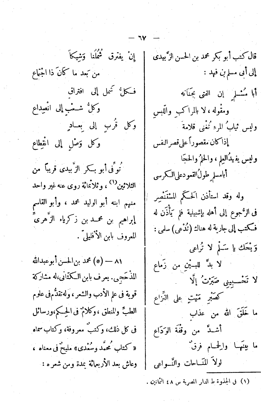 قال كتب أبو بكر محمد بن الحسن الزبيدي إلى أبي مسلم بن فهد: