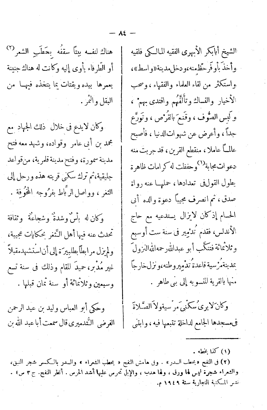 الشيخ أبا بكر الأبهري الفقيه المالكي فلقيه وأخذ بأوفر حظ منه، ودخل مدينة [واسط] واستكثر من لقاء العلماء والفقهاء، وصحب الأخيار والنساك وتألفهم واقتدى بهم، ولبس الصوف، وقنع بالقرص، وتورع جداً، وأعرض عن شهوات الدنيا، فأصبح عالماً عاملاً منقطع القرين، قد جربت منه دعوات مجابة وحفظت له كرامات ظاهرة يطول القول في تعدادها، حملها عنه رواة صدق، ثم انصرف مجيباً دعوة والده أبي الحسام إذ كان لا يزال يستدعيه مع حجاج الأندلس، فقد تدمير في سنة ست أو سبع وثلاثمائة فتنكب أبو عبد الله -رحمه الله - النزول بمدينة مرسية قاعدة تدمير وطنه ونزل خارجاً منها بالقرية المنسوبة إلى بني طاهر.
