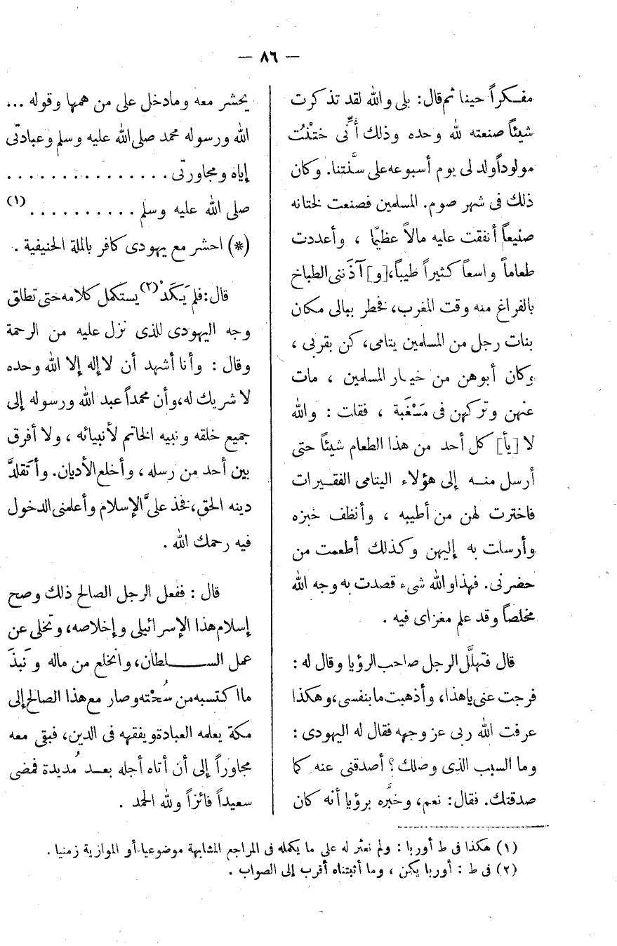 قال متهلل الرجل صاحب الرؤيا وقال له: فرجت عني يا هذا، وأذهبت ما بنفسي، وهكذا عرفت الله ربي عز وجهه، فقال له اليهودي: وما السبب الذي وصلك؟ أصدقني عنه كما صدقتك، فقال: نعم، وخبره برؤيا أنه كان يحشر معه وما دخل على من همها وقوله ... الله ورسوله محمد (صلى الله عليه وآله وسلم) وعبادتي إياه ومجاورتي [ ... ] (صلى الله عليه وآله وسلم) [ ... ] أحشر مع يهودي كافر بالملة الحنيفية.