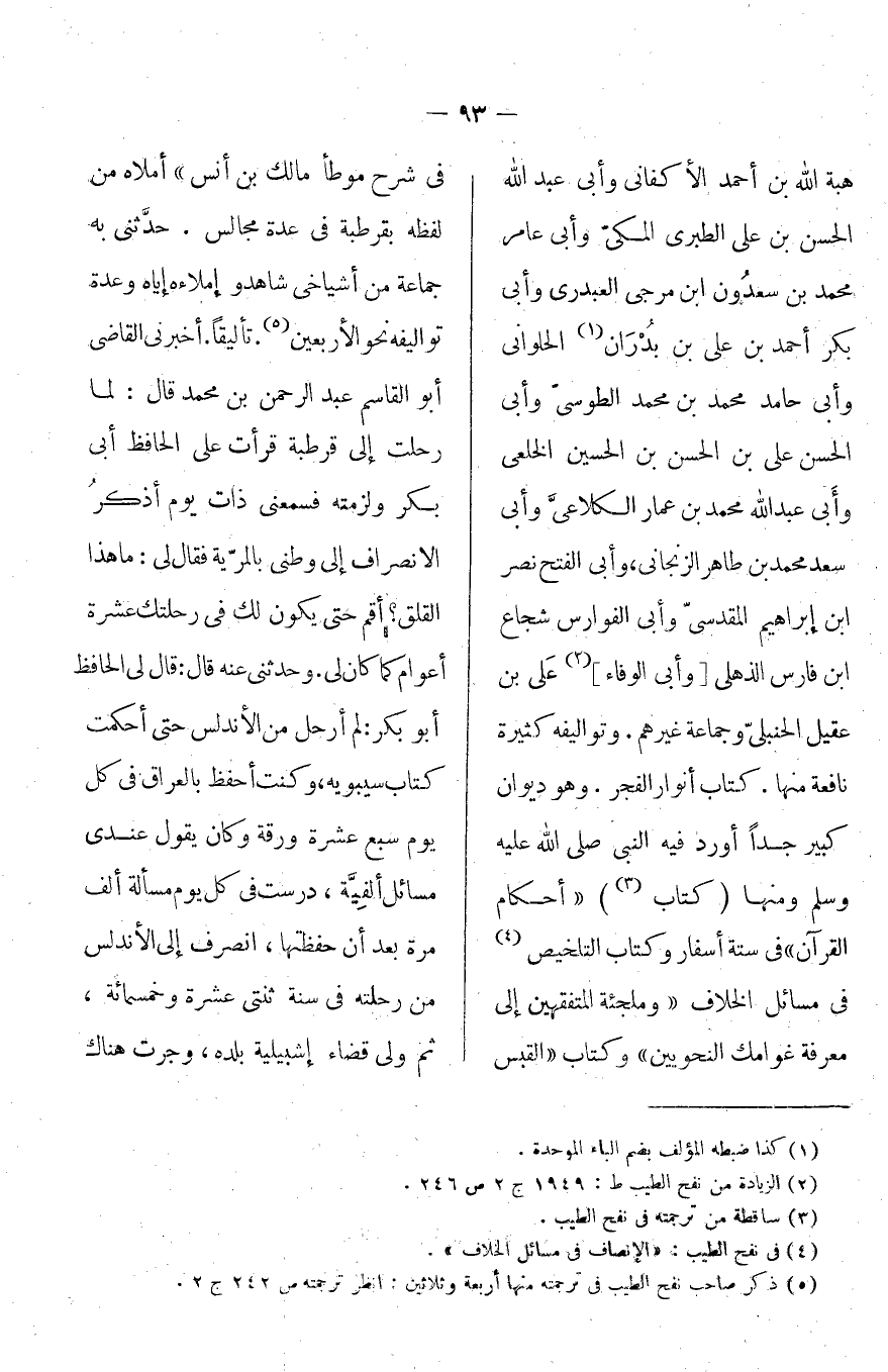 هبة الله بن أحمد الأكفاني، وأبي عبد الله الحسن بن علي بن الكبرى الملكي وأبي عارم محم بن سعدون بن مرجي العبدري وأبي بكر أحمد بن علي بن بدران الحلواني وأبي حامد محمد بن محمد الطوسي وأبي الحسن علي بن الحسن بن الحسين الخلعي وأبي عبد الله محمد بن عمار الكلاعي وأبي سعد محمد بن طاهر الزنجاني، وأبي الفتح نصر بن إبراهيم المقدسي وأبي الفوارس شجاع بن فارس الذهلي [وأبي الوفاء] علي بن عقيل الحنبلي وجماعة غيرهم، وتواليفه كثيرة نافعة منها كتاب أنوار الفجر، وهو ديوان كبير جداً أورد فيه النبي (صلى الله عليه وآله وسلم) ومنها [كتاب] "أحكام القرآن" في ستة أسفار وكتاب التلخيص في مسائل الخلاف "وملجئة المتفقهين إلى معرفة غوامض النحويين" وكتاب "القبس في شرح موطأ مالك بن أنس" أملاه من لفظه بقرطبة في عدة مجالس. حدثني به جماعة من أشياخي شاهدوا إملاءه إياه وعدة تواليفه نحو الأربعين، تأليفاً. أخبرني القاضي أبو القاسم عبد الرحمن بن محمد قال: لما رحلت إلى قرطبة قرأت علي الحافظ أبي بكر ولزمته فسمعني ذات يوم أذكر الانصراف إلى وطني بالمرية فقال لي: ما هذا القلق؟ أقم حتى يكون لك في رحلتك عشرة أعوام كما كان لي، وحدثني عنه قال: قال لي الحافظ أبو بكر: لم أرحل من الأندلس حتى أحكمت كتاب سبيويه، وكنت أحفظ بالعراق في كل يوم سبع عشرة ورقة وكان يقول عندي مسائل ألفية، درست في كل يوم مسألة ألف مرة بعد أن حفظتها، انصرف إلى الأندلس من رحلته في سنة اثنتي عشرة وخمسمائة، ثم ولي قضاء إشبيلية بلده، وجرت هنا