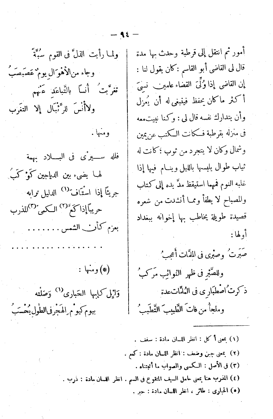 أمور ثم انتقل إلى قرطبة وحدث بها مدة. قال لي القاضي أبو القاسم: كان يقول لنا: إن القاضي إذا ولي القضاء عامين نسي أكثر ما كان يحفظ فينبغي له أن يعزل وأن يتدارك نفسه. قال لي: وكنا نبيت معه في منزله بقرطبة فكانت الكتب عن يمين وشمال وكان لا يتجرد من ثوب، كانت له ثبا طوال يلبسها بالليل وينام فيها إذا غلبه النوم فمهما استيقظ مد يده إلى كتاب والمصباح لا يطفأ ومما أنشدت من شعره قصيدة طويلة يخاطب بها إخوانه ببغداد أولها: