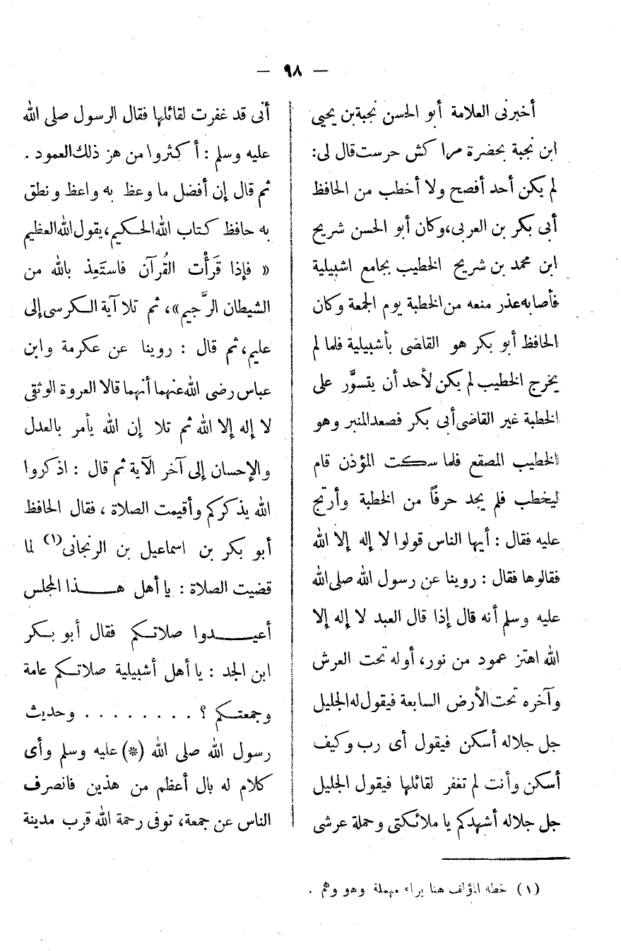 أخبرني العلامة أبو الحسن بن يحيى بن نجبة بحضرة مراكش (حرست) قال لي: لم يكن أحد أفصح ولا أخطب من الحافظ أبي بكر بن العربي، وكان أبو الحسن شريح بن محمد بن شريح الخطيب بجامع إشبيلية فأصابه عذر منعه من الخطبة يوم الجمعة وكان الحافظ أبو بكر غير القاضي أبي بكر، فصعد المنبر وهو الخطيب المصقع فلما سكت المؤذن قام ليخطب فلم يجد حرفاً من الخطبة وارتج عليه. فقال: أيها الناس قولوا لا إله إلا الله فقالوها: فقال: روينا عن رسول الله (صلى الله عليه وآله وسلم) أنه قال: "إذا قال العبد لا إله إلا الله اهتز عمود من نور، أوله تحتد العرش وآخره تحت الأرض السابعة، فيقول له الجليل جل جلاله اسكن فيقول: أي رب وكيف أسكن وأنت لم تغفر لقائلها. فيقول: الجليل جل أشهدكم يا ملائكتي وحملة عرشي أني قد غفرت لقائلها". فقال الرسول (صلى الله عليه وآله وسلم) : "أكثروا من هز ذلك العمود"، يقول الله العظيم: {فإذا قرأت القرآن فاستعذ بالله من الشيطان الرجيم} ، ثم تلا آية الكرسي إلى عليم، ثم قال: روينا عن عكرمة وابن عباس رضي الله عنهما أنهما قالا: العروة الوثقى لا إله إلا الله، ثم تلا: {إن الله يأمر بالعدل والإحسان} إلى آخر الآية، ثم قال: اذكروا الله يذكركم وأقيمت الصلاة، فقال الحافظ أبو بكر بن إسماعيل بن الرنجاني لما قضيت الصلاة، يا أهل هذا المجلس أعيدوا صلاتكم. فقال أبو بكر بن الجد: يا أهل إشبيلية صلاتكم عامة وجمعتكم [ ... ] وحديث رسول الله (صلى الله عليه وآله وسلم) وأي كلام له بال أعظم من هذين فانصرف الناس عن جمعة، توفى - رحمه الله - قرب مدينة