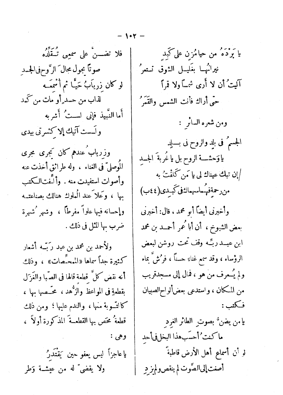 وأخبرني أيضا أبو محمد، قال: أخبرني بعض الشيوخ، أن أبا عمر أحمد بن محمد ابن عبد ربه وقف تحت روشن لبعض الرؤساء، وقد سمع غناء حسناً، فرش بماء ولم يعرف من هو، فمال إلى مسجد قريب من المكان، واستدعى بعض ألواح الصبيان فكتب: