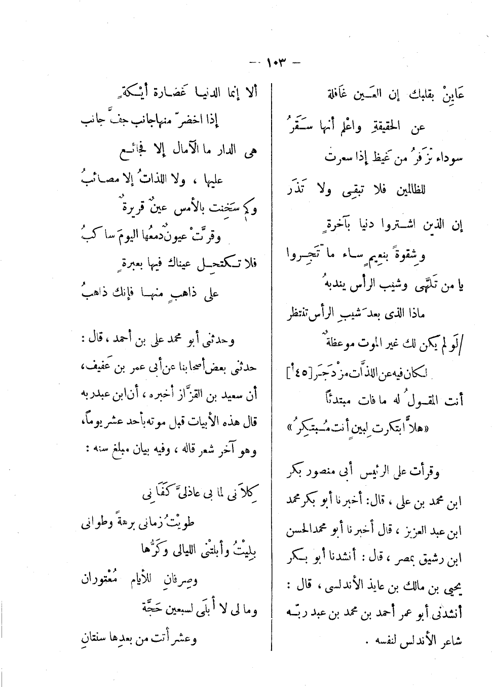 وقرأت على الرئيس أبي منصور بكر بن محمد بن علي، قال: أخبرنا أبو بكر محمد ابن عبد العزيز، قال: أخبرنا أبو محمد الحسن بن رشيق بمصر، قال: أنشدنا أبو بكر يحيى بن مالك بن عايذ الأندلسى، قال: أنشدني أبو عمر أحمد بن محمد بن عبد ربه شاعر الأندلس لنفسه: