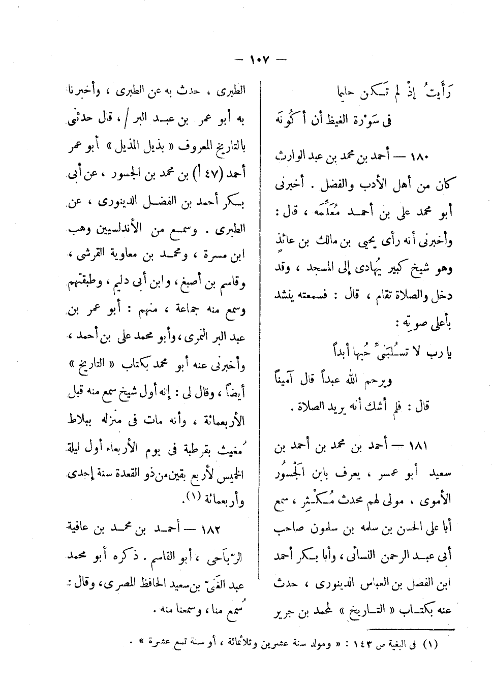 أحمد بن محمد بن أحمد بن سعيد أبو عمر، يعرف بابن الجسور الأموي، مولى لهم محدث مكثر؛ سمع أبا علي الحسن بن سلمة بن سلمون صاحب أبي عبد الرحمن النسائى، وأبا بكر أحمد بن الفضل بن العباس الدينوري؛ حدث عنه بكتاب التاريخ لمحمد بن جرير الطبري، حدثه به عن الطبري؛ وأخبرنا به أبو عمر ابن عبد البر، قال حدثني بالتاريخ المعروف بذيل المذيل أبو عمر أحمد ابن محمد بن الجسور، عن أبي بكر أحمد بن الفضل الدينوري، عن الطبري. وسمع من الأندلسيين وهب بن مسرة، ومحمد بن معاوية القرشي، وقاسم بن أصبغ، وابن أبي دليم، وطبقتهم؛ وسمع منه جماعة، منهم: أبو عمر بن عبد البر النمري، وأبو محمد على بن أحمد، وأخبرني عنه أبو محمد بكتاب التاريخ أيضا، وقال لي: إنه أول شيخ سمع منه قبل الأربع مائة، وأنه مات في منزله ببلاط مغيث بقرطبة في يوم الأربعاء أول ليلة الخميس لأربع بقين من ذي القعدة سنة إحدى وأربع مائة.