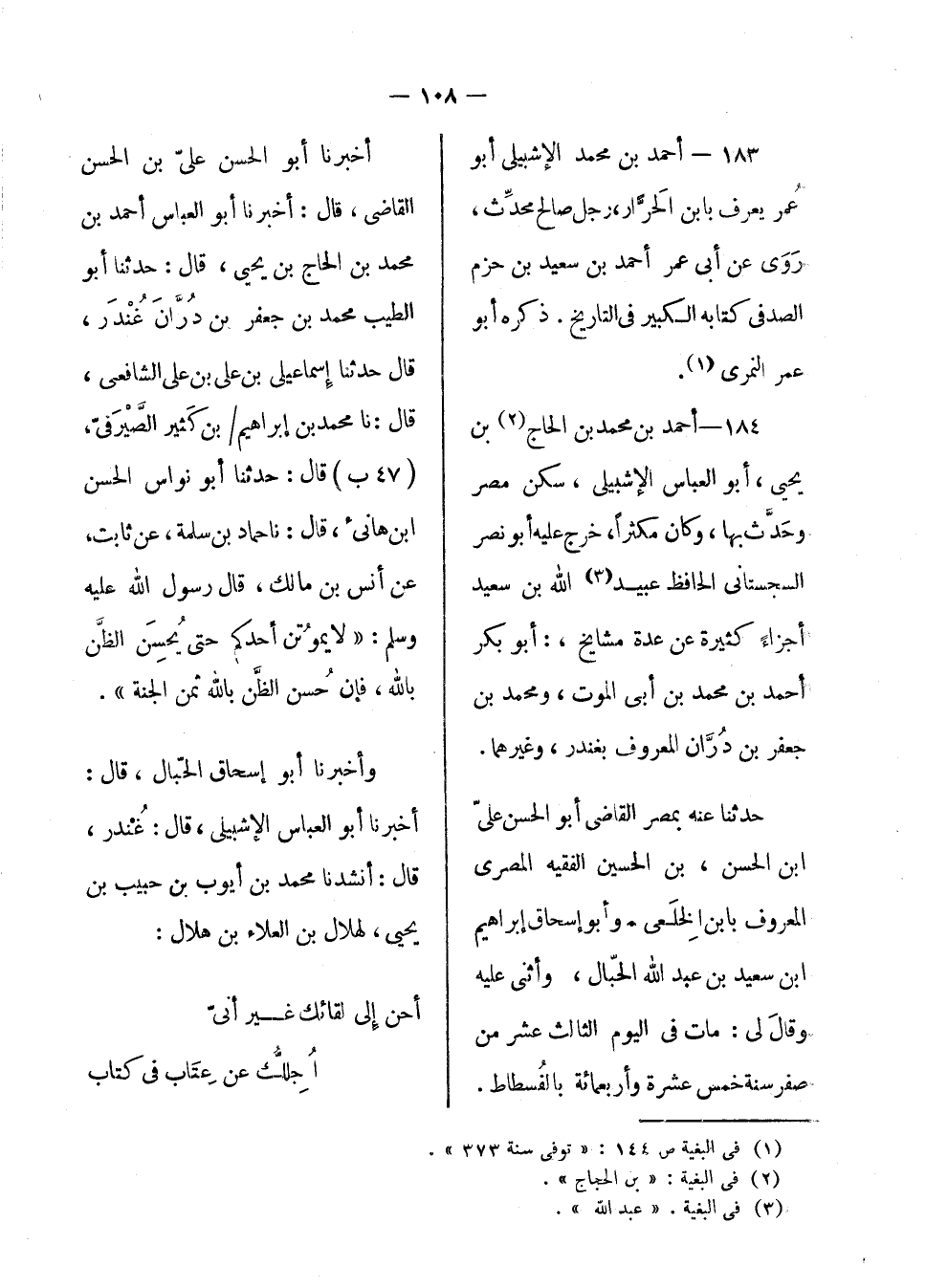 وأخبرنا أبو إسحاق الحبال، قال: أخبرنا أبو العباس الإشبيلي، قال: نا غندر، قال: أنشدنا محمد بن أيوب بن حبيب بن يحيى، لهلال بن العلاء بن هلال: