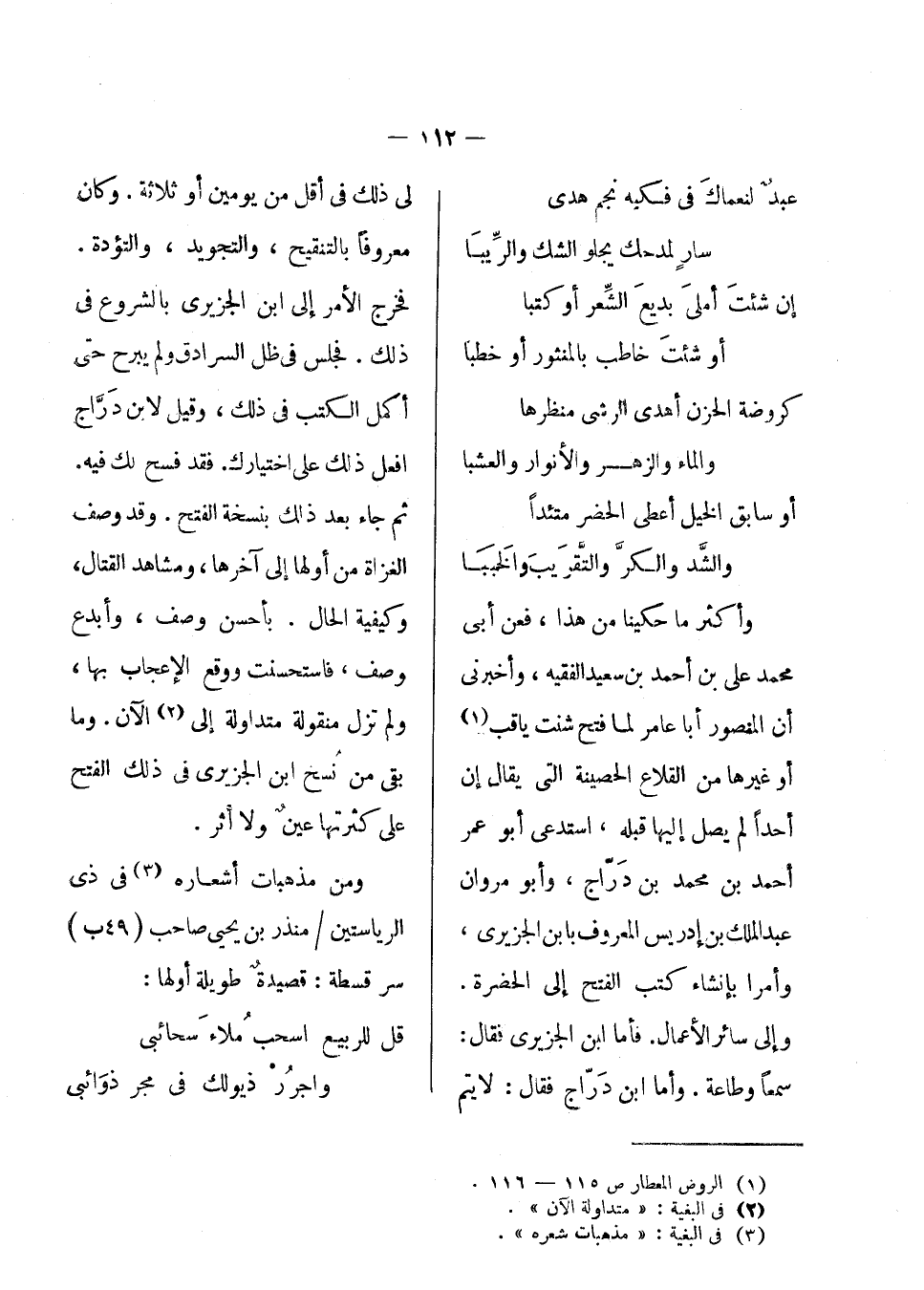 وأكثر ما حكينا من هذا، فعن أبي محمد علي بن أحمد بن سعيد الفقيه؛ وأخبرني أن المنصور أبا عامر لما فتح شنت ياقب أو غيرها من القلاع الحصينة التي يقال إن أحداً لم يصل إليها قبله، استدعى أبو عمر أحمد بن محمد بن دراج، وأبو مروان عبد الملك بن إدريس المعروف بابن الجزيري، وأمرا بإنشاء كتب الفتح إلى الحضرة، وإلى سائر الأعمال، فأما ابن الجزيرى فقال: سمعاً وطاعة، وأما ابن دراج فقال: لا يتم لي ذلك في أقل من يومين أو ثلاثة، وكان معروفاً بالتنقيح، والتجويد، والتؤدة، فخرج الأمر إلى ابن الجزيري بالشروع في ذلك، فجلس في ظل السرادق ولم يبرح حتى أكمل الكتب في ذلك، وقيل لابن دراج افعل ذلك على اختيارك، فقد فسح لك فيه، ثم جاء بعد ذلك بنسخة الفتح، وقد وصف الغزاة من أولها إلى آخرها، ومشاهد القتال، وكيفية الحال، بأحسن وصف، وأبدع رصف، فاستحسنت ووقع الإعجاب بها، ولم تزل منقولة متداولة وإلى الآن، وما بقي من نسخ ابن الجزيري في ذلك الفتح على كثرتها عين ولا أثر.