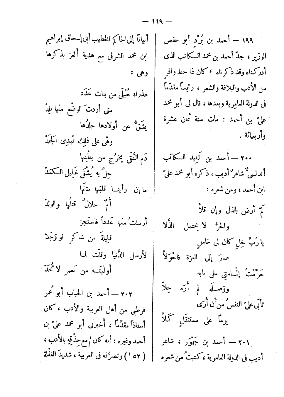 أحمد بن برد أبو حفص الوزير، جد أحمد بن محمد الكاتب الذي أكردناه وقد ذكرناه؛ كان ذا حظ وافر من الأدب والبلاغة والشعر، رئيساً مقدماً في الدولة العامرية وبعدها؛ قال لي أبو محمد علي بن أحمد: مات سنة ثمان عشرة وأربع مائة.