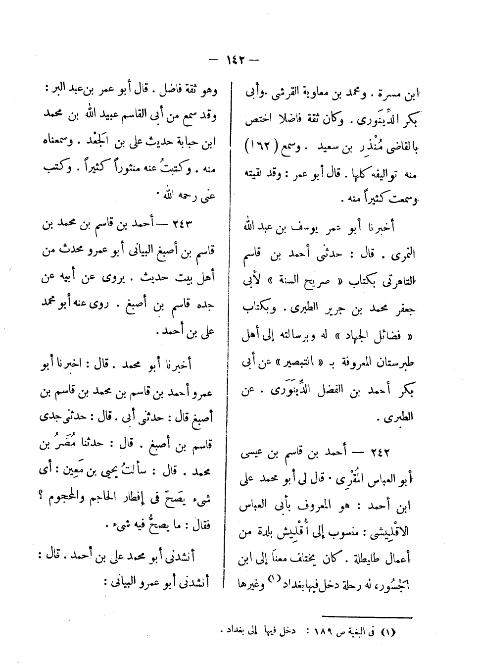 أخبرنا أبو عمر يوسف بن عبد الله النمري، قال: حدثني أحمد بن قاسم التاهرتى بكتاب صريح السنة لأبي جعفر محمد بن جرير الطبري، وبكتاب فضائل الجهاد له، وبرسالته إلى أهل طبرستان المعروفة بالتبصير عن أبي بكر أحمد ابن الفضل الدينوري، عن الطبري.