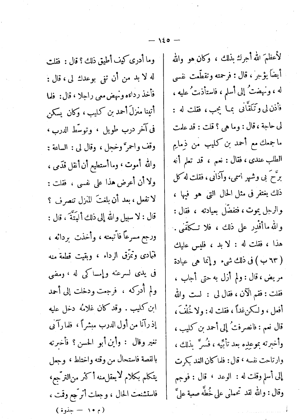 لأعظم الله أجرك بذلك، وكان هو والله أيضا يؤجر، قال: فرحمته وتقطعت نفسي له، ونهضت إلى أسلم، فاستأذنت عليه، فأذن لي وتلقاني بما يجب، فقلت له: لي حاجة، قال: وما هي؟ قلت: قد علمت ما جمعك مع أحمد بن كليب من ذمام الطلب عندي، فقال: نعم، ولكن قد تعلم أنه برح بي، وشهر اسمى، وآذاني، فقلت له كل ذلك يغتفر في مثل الحال التي هو فيها، والرجل يموت، فتفضل بعيادته، فقال: والله ما أقدر على ذلك، فلا تكلفنى هذا، فقلت له: لابد، فليس عليك في ذلك شيء وإنما هي عيادة مريض، قال: ولم أزل به حتى أجاب، فقلت: فقم الآن، فقال لي: لست والله أفعل، ولكن غداً، فقلت له: ولا خلف، قال نعم: فانصرفت إلى أحمد بن كليب، وأخبرته بموعده بعد تأبيه، فسر بذلك، وارتاحت نفسه، قال: فلما كان الغد بكرت إلى أسلم وقلت له: الوعد، قال: فوجم وقال: والله لقد تحملنى على خطة صعبة علي، وما أدرى كيف أطيق ذلك؟ قال: فقلت له لابد من أن تفى بوعدك لي، قال: فأخذ رداءه ونهض معي راجلا، قال: فلما أتينا منزل أحمد بن كليب، وكان يسكن في آخر درب طويل، وتوسط الدرب، وقف واحمر وخجل، وقال لي: الساعة والله أموت، وما أستطيع أن أنقل قدمى، ولا أن أعرض هذا على نفسى، فقلت: لا تفعل، بعد أن بلغت المنزل تنصرف؟ قال: لا سبيل والله إلى ذلك ألبتة، قال: ورجع مسرعاً فاتبعته، وأخذت بردائه، فتمادى وتمزق الرداء، وبقيت قطعة منه في يدي لسرعته وإمساكى له، ومضى ولم أدركه، فرجعت ودخلت إلى أحمد بن كليب، وقد كان غلامه دخل عليه إذ رآنا من أول الدرب مبشراً، فلما رآني تغير وقال: وأين أبو الحسن؟ فأخبرته بالقصة فاستحال من وقته واختلط، وجعل يتكلم بكلام لا يعقل منه أكثر من الترجع، فاستشنعت الحال، وجعلت أترجع وقمت،