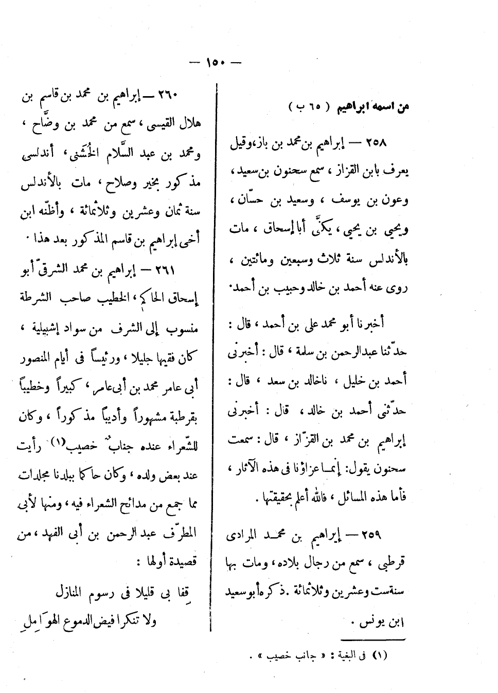 أخبرنا أبو محمد على بن أحمد، قال: حدثنا عبد الرحمن بن سلمة، قال: أخبرني أحمد بن خليل، قال: نا خالد بن سعد، قال: حدثني أحمد بن خالد، قال: أخبرني إبراهيم بن محمد بن القزاز، قال: سمعت سحنون يقول: إنما عزاؤنا في هذه الآثار، فأما هذه المسائل، فالله أعلم بحقيقتها.