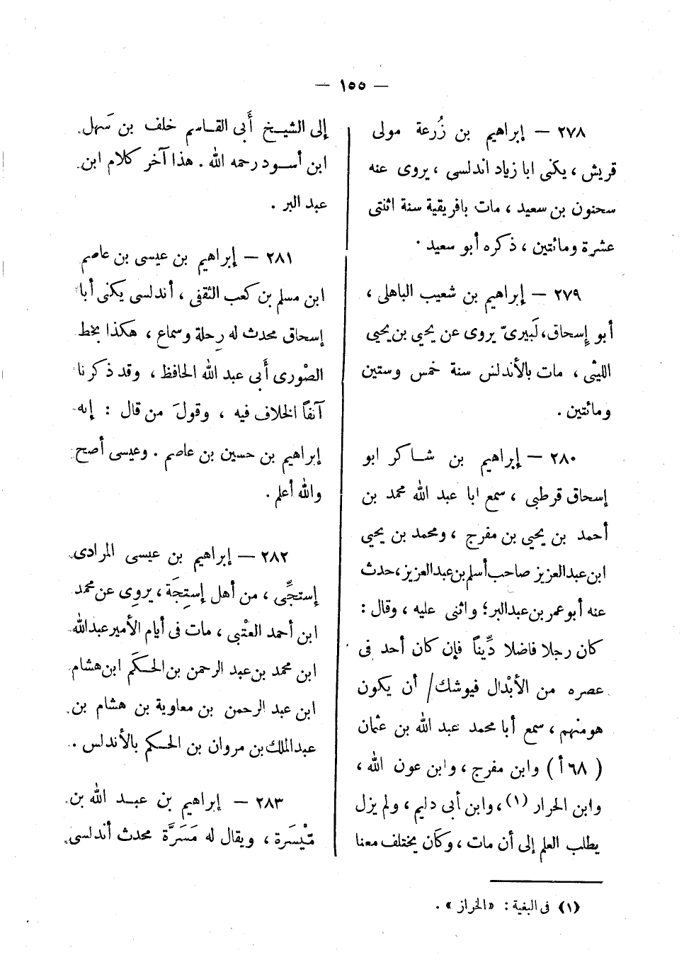 إبراهيم بن شاكر أبو إسحاق قرطبي، سمع أبا عبد الله محمد بن أحمد ابن يحيى بن مفرج، ومحمد بن يحيى بن عبد العزيز صاحب أسلم بن عبد العزيز، حدث عنه أبو عمر بن عبد البر، وأثنى عليه، وقال: كان رجلاً فاضلاً ديناً فإن كان أحد في عصره من الأبدال فيوشك أن يكون هو منهم؛ وقال: سمع أبا محمد عبد الله بن عثمان وابن مفرج، وابن عون الله، وابن الحرار، وابن أبي دليم، ونظراءهم، ولم يزل يطلب العلم إلى أن مات، وكان يختلف معنا إلى الشيخ أبي القاسم خلف بن قاسم بن سهل ابن أسود رحمه الله. هذا آخر كلام ابن عبد البر.