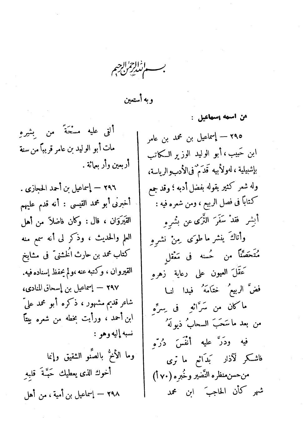 إسماعيل بن محمد بن عامر بن حبيب، أبو الوليد الوزير الكاتب بإشبيلية له ولأبيه قدم في الأدب والرياسة، وله شعر كثير يقوله بفضل أدبه؛ وقد جمع كتاباً في فصل الربيع، ومن شعره فيه: