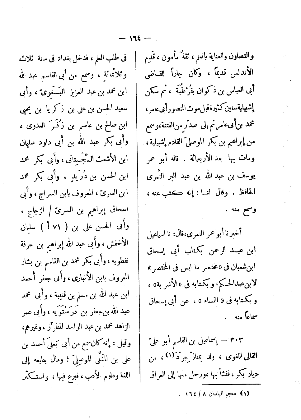 والتصاون والعناية بالعلم، ثقة مأمون، قدم الأندلس قديماً، وكان جاراً للقاضي أبي العباس ابن ذكوان بقرطبة، ثم سكن إشبيلية سنين كثيرة قبل موت المنصور أبي عامر محمد بن أبي عامر، ثم إلى صدر من الفتنة، وسمع من إبراهيم بن بكر الموصلي القادم إشبيلية؛ ومات بها بعد الأربع مائة. قاله أبو عمر يوسف بن عبد الله بن عبد البر النمرى الحافظ. وقال لنا: إنه كتب عنه، وسمع منه.