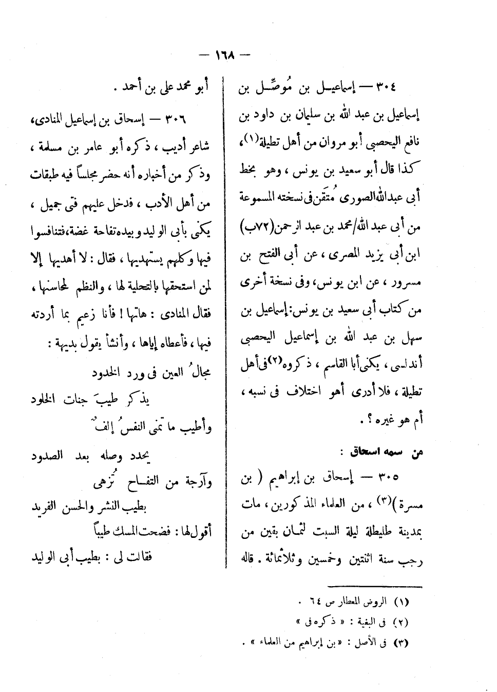 إسماعيل بن موصل بن إسماعيل بن عبد الله بن سليمان بن داود بن نافع اليحصبى أبو مروان من أهل تطيلة، كذا قال أبو سعيد بن يونس، وهو بخط أبي عبد الله الصورى متقن في نسخته المسموعة من أبي عبد الله محمد بن عبد الرحمن ابن أبي يزيد المصرى، عن أبي الفتح بن مسرور، عن ابن يونس؛ وفي نسخة أخرى من كتاب أبي سعيد بن يونس: إسماعيل بن سهل بن عبد الله بن إسماعيل اليحصبى أندلسى، يكنى أبا القاسم؛ ذكروه في أهل تطيلة، فلا أدرى أهو اختلاف في نسبه، أم هو غيره؟.