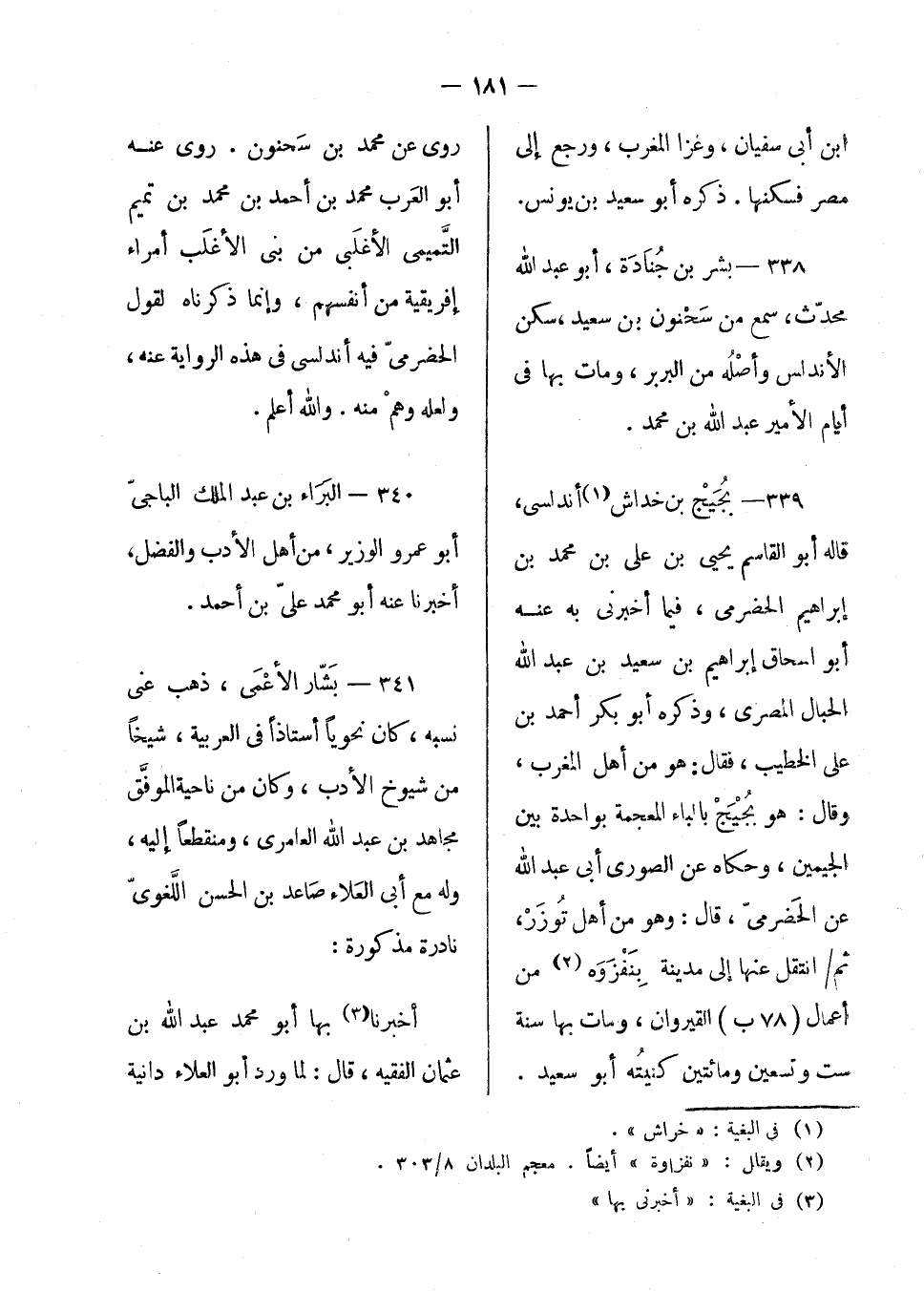 بجيج بن خداش أندلسى، قاله أبو القاسم يحيى بن علي بن إبراهيم الحضرمي، فيما أخبرني به عنه أبو اسحاق إبراهيم بن سعيد بن عبد الله الحبال المصري، وذكره أبو بكر أحمد بن علي الخطيب، فقال: هو من أهل المغرب، وقال: هو بجيج بالباء المعجمة بواحدة بين الجيمين، وحكاه عن الصوري أبي عبد الله عن الحضرمي؛ قال: وهو من أهل توزر، ثم انتقل عنها إلى مدينة بنفزوة من أعمال القيروان، ومات بها سنة ست وتسعين ومائتين كنيته أبو سعيد. روى عن محمد بن سحنون. روى عنه أبو العرب محمد بن أحمد بن محمد بن تميم التميمي الأغلبي من بني الأغلب أمراء إفريقية من أنفسهم، وإنما ذكرناه لقول الحضرمي فيه أندلسي في هذه الرواية عنه، ولعله وهم منه. والله أعلم.