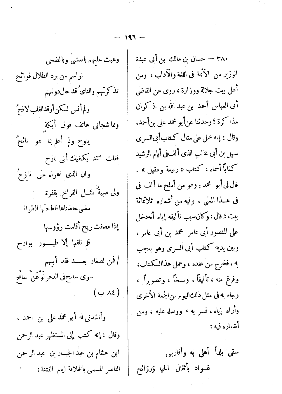 حسان بن مالك بن أبي عبدة الوزير من الأئمة في اللغة والآداب. ومن أهل بيت جلالة ووزارة، روى عن القاضي أبي العباس أحمد بن عبد الله بن ذكوان مذاكرة،؛ وحدثنا عنه أبو محمد علي بن أحمد، وقال: إنه عمل على مثال كتاب أبي السري سهل بن أبي غالب الذي ألف في أيام الرشيد كتاباً أسماه: كتاب ربيعة وعقيل. قال لي أبو محمد: وهو من أملح ما ألف في هذا المعنى، وفيه من أشعاره ثلاث مائة بيت؛ قال: وكان سبب تأليفه إياه أنه دخل على المنصور أبي عامر محمد ابن أبي عامر، وبين يديه كتاب أبي السري وهو يعجب به، فخرج من عنده، وعمل هذا الكتاب، وفرغ منه، تأليفاً، ونسخاً، وتصويراً، وجاء به في مثل ذلك اليوم من الجمعة الأخرى وأراه إياه، فسر به، ووصله عليه، ومن أشعاره فيه: