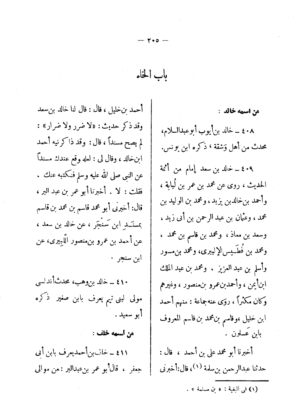 أخبرنا أبو محمد علي بن أحمد، قال: حدثنا عبد الرحمن بن سلمة، قال: أخبرني أحمد بن خليل، قال: قال لنا خالد بن سعد، وقد ذكر حديث: لا ضرر ولا ضرار: لم يصح مسنداً، قال: وقد ذاكرنيه أحمد بن خالد، وقال لي: لعله وقع عندك مسنداً عن النبي صلى الله عليه وسلم فنكتبه عنك، فقلت: لا. أخبرنا أبو عمر بن عبد البر، قال: أخبرني أبو محمد قاسم بن محمد بن قاسم بمسند ابن سنجر، عن خالد بن سعد، عن أحمد بن عمرو بن منصور اللبيري، عن ابن سنجر.