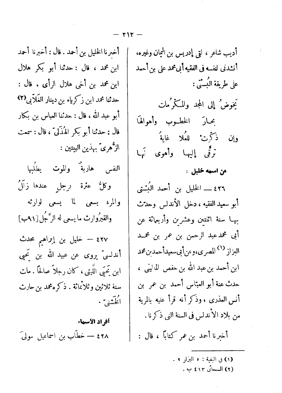 أخبرنا أحمد بن عمر كتاباً، قال: أخبرنا الخليل بن أحمد. قال: أخبرنا أحمد بن محمد، قال: حدثنا أبو بكر هلال بن محمد ابن أخي هلال الرأى، قال: حدثنا محمد ابن زكرياء بن دينار الغلابي أبو عبد الله، قال: حدثنا العباس بن بكار، قال: حدثنا أبو بكر الهذلي، قال: سمعت الزهري يتمثل بهذين البيتين:
