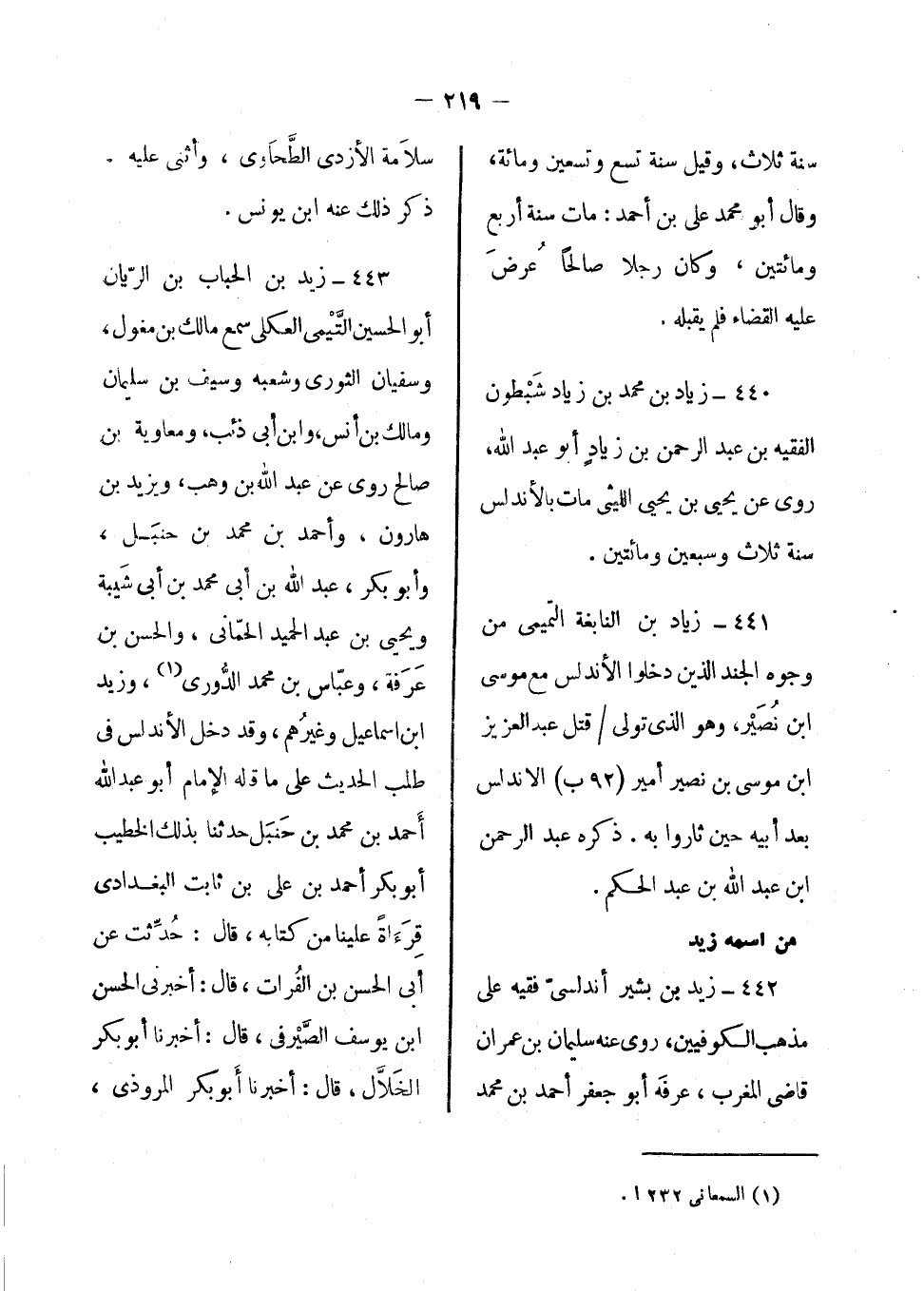 زيد بن الحباب بن الريان أبو الحسين التيمي العكلي سمع مالك بن مغول، وسفيان الثورى، وشعبة، وسيف بن سليمان، ومالك بن أنس، وابن أبي ذئب، ومعاوية بن صالح؛ روى عنه عبد الله بن وهب، ويزيد بن هارون، وأحمد ابن محمد بن حنبل، وأبو بكر عبد الله بن أبي محمد بن أبي شيبة ويحيى بن عبد الحميد الحماني والحسن بن عرفة، وعباس بن محمد الدورى، وزيد بن إسماعيل وغيرهم، وقد دخل الأندلس في طلب الحديث على ماقاله الإمام أبو عبد الله أحمد بن محمد بن حنبل حدثنا بذلك الخطيب أبو بكر أحمد بن علي بن ثابت البغدغدي قراءة علينا من كتابه، قال: حدثت عن أبي الحسن بن الفرات، قال: أخبرني الحسن بن يوسف الصيرفي، قال: أخبرنا أبو بكر الخلال، قال: أخبرنا أبو بكر المروذى،