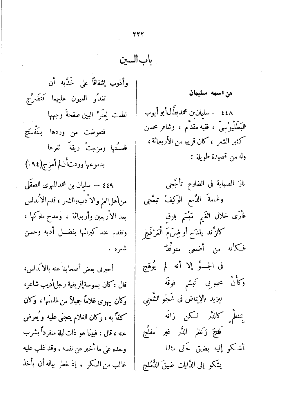 سليمان بن محمد بطال أبو أيوب البطليوسى، فقيه مقدم، وشاعر محسن كثير الشعر، كان قريباً من الأربع مائة؛ وله من قصيدة طويلة: