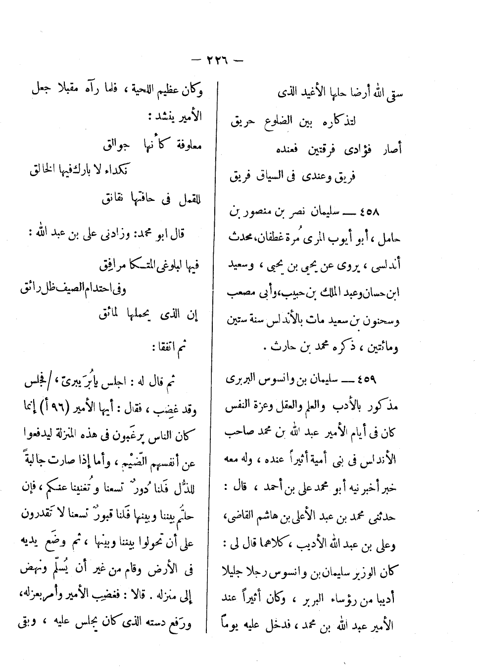 سليمان بن وانسوس البربرى الوزير مذكور بالأدب والعلم والعقل وعزة النفس كان في أيام الأمير عبد الله بن محمد صاحب الأندلس في بنى أمية أثيراً عنده، وله معه أخبر نيه أبو محمد على بن أحمد، قال: حدثني محمد بن عبد الأعلى بن هاشم القاضي، وعلى بن عبد الله الأديب، كلاهما قال لي: كان الوزير سليمان بن وانسوس رجلاً جليلاً. أديباً من رؤساء البربر، وكان أثيراً عند الأمير عبد الله بن محمد، فدخل عليه يوماً وكان عظيم اللحية، فلما رآه مقبلاً جعل الأمير ينشد: