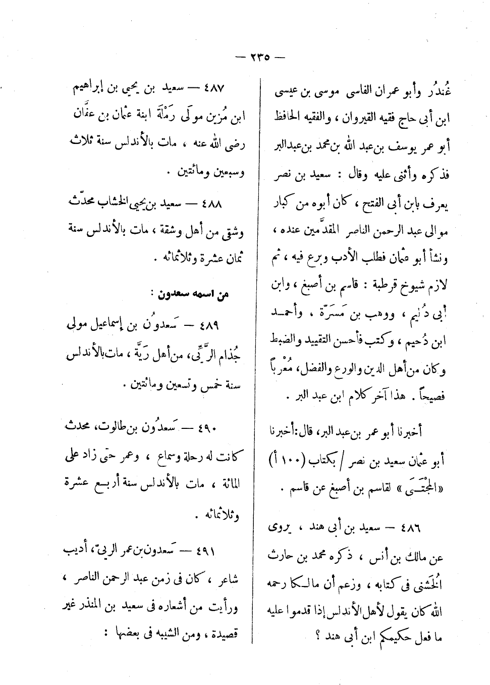 سعيد بن أبي هند، يروى عن مالك بن أنس، ذكره محمد بن حارث الخشنى في كتابه، وزعم أن مالكا رحمه الله كان يقول لأهل الأندلس إذا قدموا عليه: ما فعل حكيمكم ابن أبي هند؟ سعيد بن يحيى بن إبراهيم بن مزين مولى رملة ابنة عثمان بن عفان رضى الله عنه، مات بالأندلس سنة ثلاث وسبعين ومائتين.