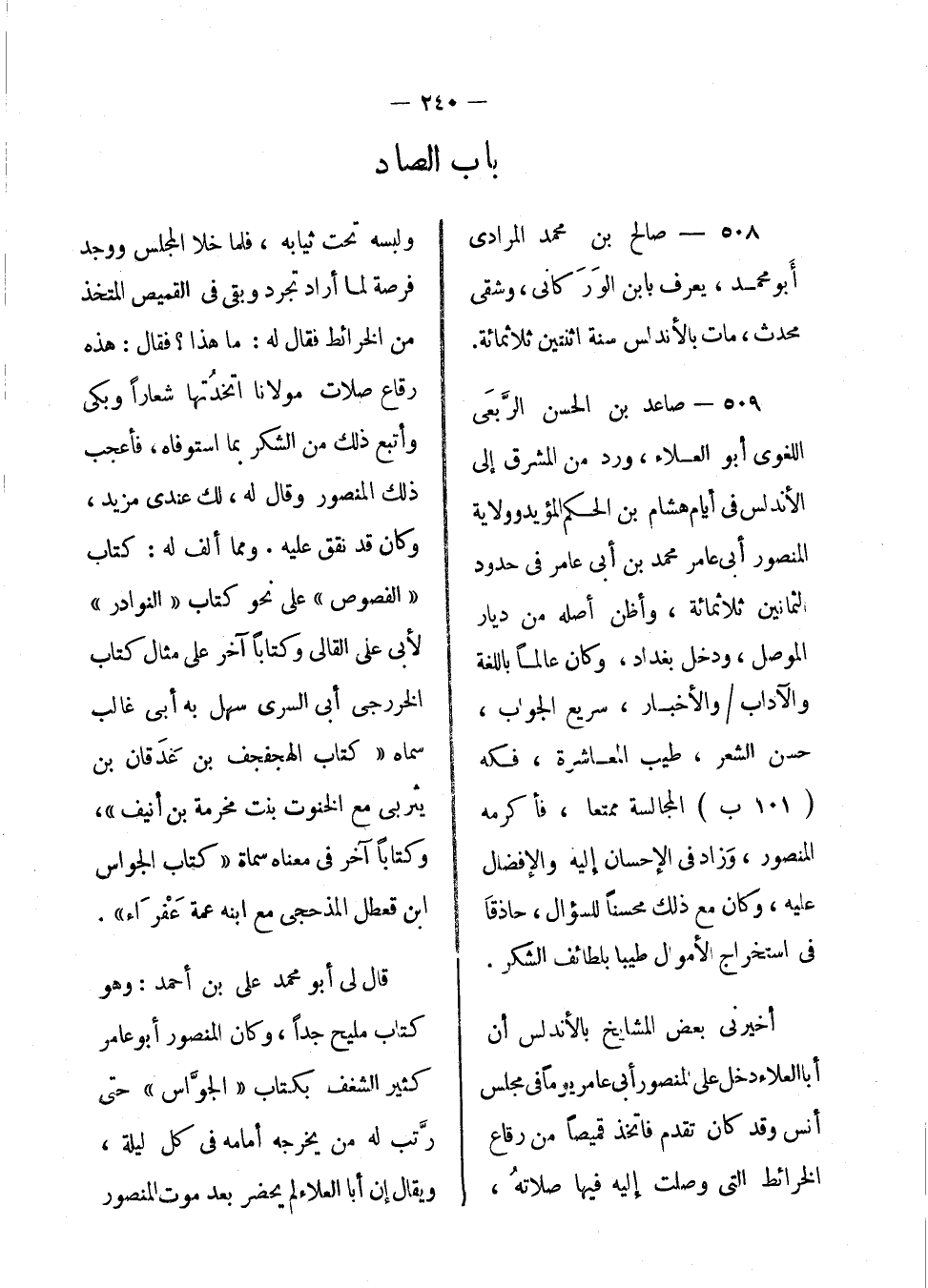 صاعد بن الحسن الربعي اللغوي أبو العاء، ورد من المشرق إلى الأندلس في أيام هشام بن الحكم المؤيد وولاية المنصور أبي عامر محمد بن أبي عامر في حدود الثمانين وثلاث مائة، وأظن أصله من ديار الموصل، ودخل بغداد، وكان عالماً باللغة والآداب والأخبار، سريع الجواب، حسن الشعر، طيب المعاشر، فكه المجالسة ممتعا، فأكرمه المنصور، وزاد في الإحسان إليه والإفضال عليه، وكان مع ذلك محسناً للسؤال، حاذقاً في استخراج الأموال طباً بلطائف الشكر.