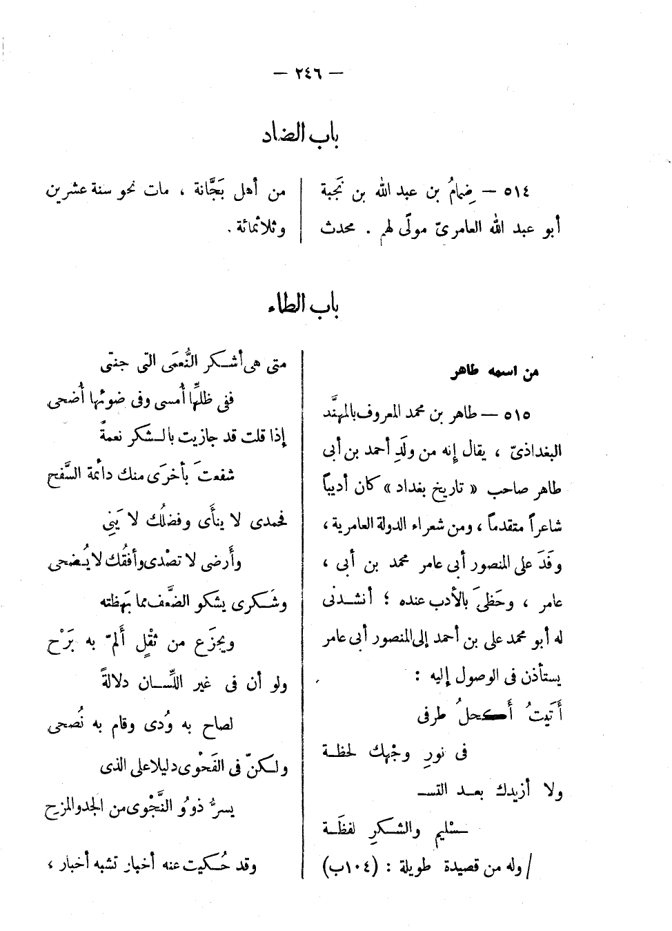 طاهر بن محمد المعروف بالمهند البغدادي، يقال إنه من ولد أحمد بن أبي طاهر صاحب تاريخ بغداد، كان أديباً شاعراً متقدماً، ومن شعراء الدولة العامرية، وفد على المنصور أبي عامر محمد بن أبي عامر، وحظى بالأدب عنده؛ أنشدني له أبو محمد علي بن أحمد إلى المنصور أبي عامر يستأذن في الوصول إليه: