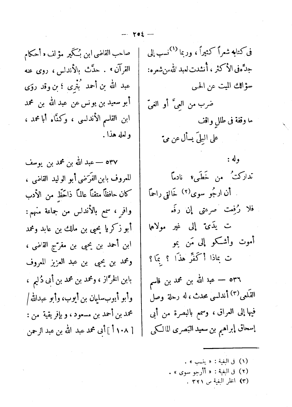 عبد الله بن محمد بن يوسف المعروف بابن الفرضى أبو الوليد القاضي، كان حافظاً متقاناً عالماً ذا حظ من الأدب وافر، سمع بأندلس من جماعة منهم: أبو زكريا يحيى بن مالك بن عايد، ومحمد بن أحمد بن يحيى بن مفرج القاضي، ومحمد ابن يحيى بن عبد العزيز المعروف بابن الخراز، ومحمد بن محمد بن أبي دليم، وابو أيوب سليمان بن أيوب، وأبو عبد الله محمد بن أحمد بن مسعود، وبإفريقية من أبي عبد الله بن عبد الرحمن