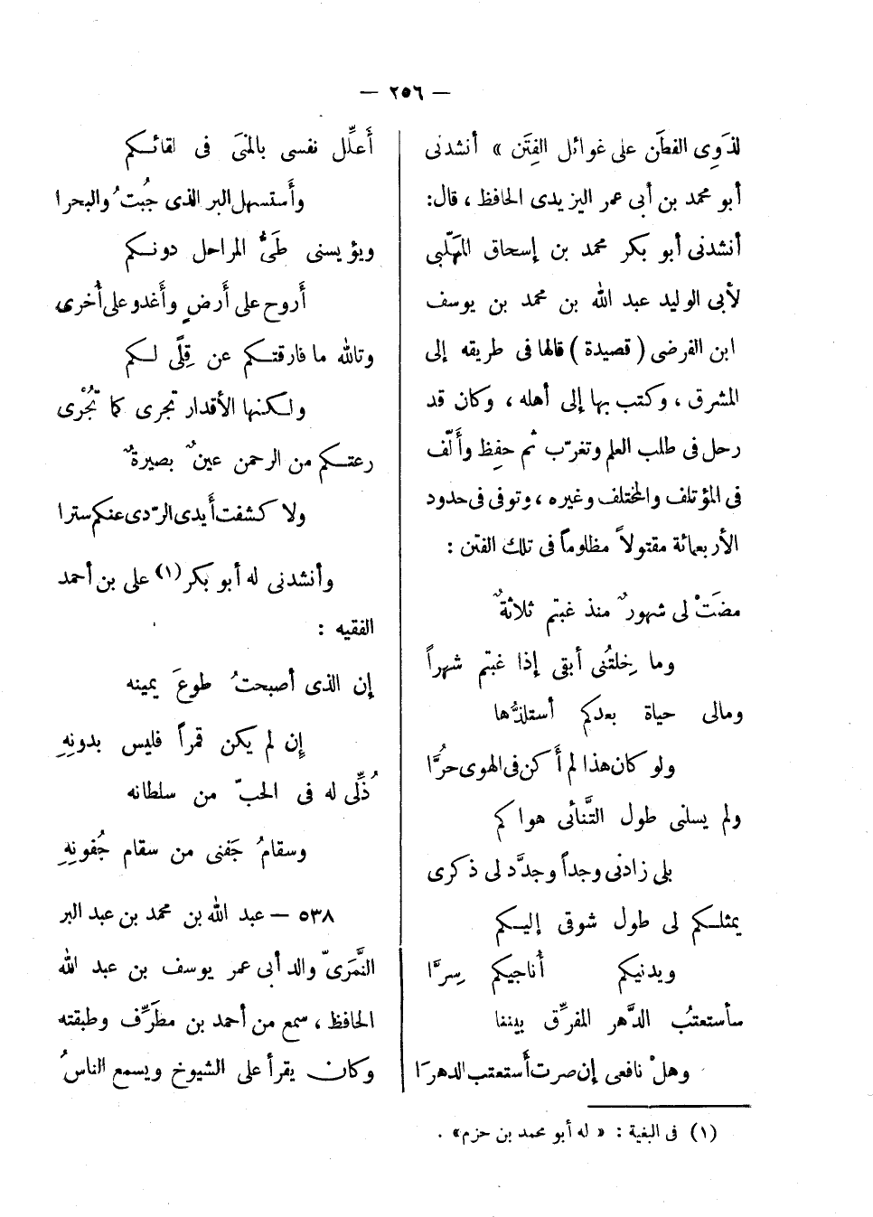 لذوى الفطن على غوائل الفتن أنشدني أبو محمد ابن أبي عمر اليزيدي الحافظ، قال: أندشني أبو بكر محمد بن إسحاق المهلبي لأبي الوليد عبد الله بن محمد بن يوسف بن الفرضى قصيدة قالها في طريقه إلى المشرق، وكتب بها إلى أهله، وكان قد رحل في طلب العلم وتغرب ثم حفظ وألف في المؤتلف والمختلف وغيره، وتوفي في حدود الأربع مائة مقتولاً مظلوماً في تلك الفتن: