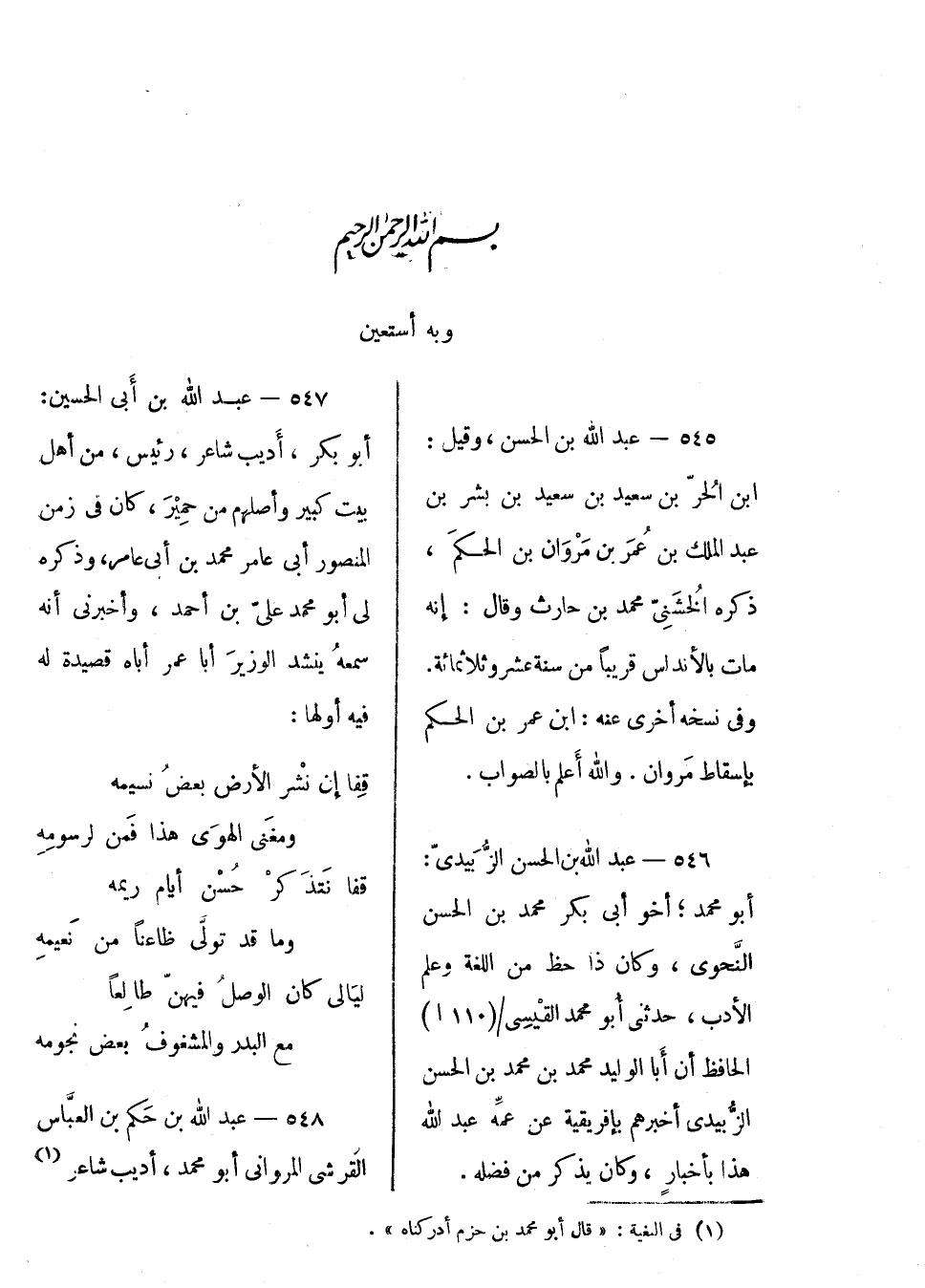 بسم الله الرحمن الرحيم وبه نستعين عبد الله بن الحسن، وقيل: ابن الحر بن سعيد بن سعيد بن بشر بن عبد الملك بن عمر بن مروان بن الحكم، ذكره الخشنى محمد بن حارث وقال: إنه مات بالأندلس قريباً من سنة عشر وثلاث مائة. وفي نسخة أخرى عنه: ابن عمر بن الحكم بإسقاط مروان. والله أعلم بالصواب.
