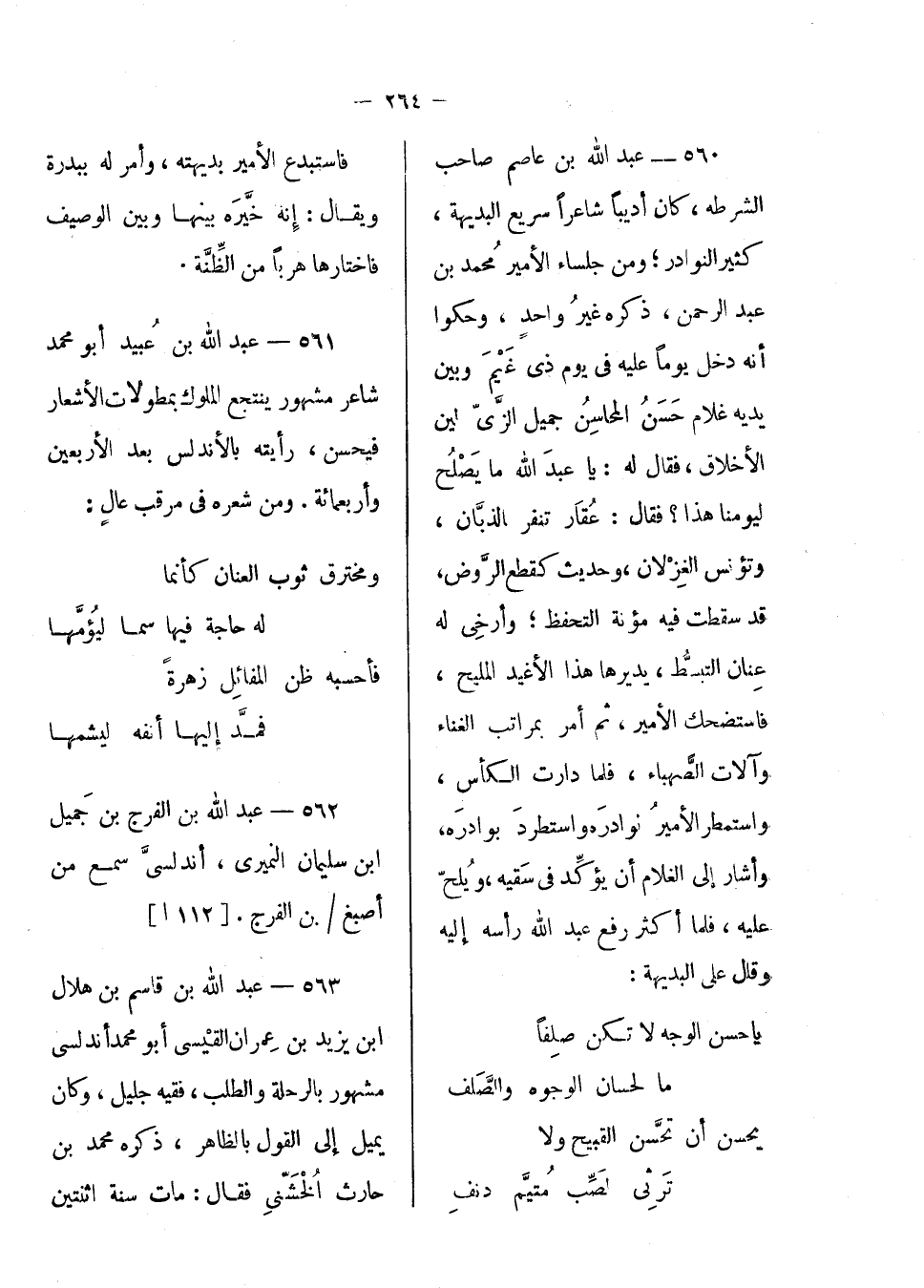 عبد الله بن عاصم صاحب الشرطة، كان أديباً شاعراً سريع البديهة، كثير النوادر، ومن جلساء الأمير محمد بن عبد الرحمن، ذكره غير واحد، وحكوا أنه دخل يوماً عليه في يوم ذى غيم وبين يديه غلام حسن المحاسن جميل الزي لين الأخلاق، فقال له: يا عبد الله ما يصلح ليومنا هذا؟ فقال: عقار تنفر الذبان، وتؤنس الغزلان، وحديث كقطع الروض، قد سقطت فيه مؤنة التحفظ، وأرخى له عنان التبسط، يديرها هذا الأغيد المليح، فاستضحك الأمير، ثم أمر بمراتب الغناء وآلات الصبهاء، فلما دارت الكأس، واستمطر الأمير نوادره واستطرد بوادره، وأشار إلى الغلام أن يؤكد في سقيه، ويلح عليه، فلما أكثر رفع عبد الله رأسه إليه وقال على البديهة: