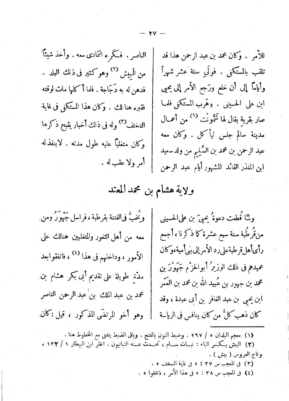 للأمر؛ وكان محمد بن عبد الرحمن هذا قد تلقب بالمستكفى، فولى ستة عشر شهراً وأياماً إلى أن خلع ورجع الأمر إلى يحيى بن علي الحسنى، وهرب المستكفى فلما صار بقرية يقال لها شمونت من أعمال مدينة سالم جلس ليأكل، وكان معه عبد الرحمن بن محمد ابن السليم من ولد سعيد بن المنذر القائد المشهور أيام عبد الرحمن الناصر، فكره التمادي معه، وأخذ شيئاً من البيش وهو كثير في ذلك البلد، فدهن له به دجاجة، فلما أكلها مات لوقته، فقبره هنالك، وكان هذا المستكفى في غاية التخلف وله في ذلك أخبار يقبح ذكرها، وكان متغلباً عليه طول مدته، لا ينفذ له أمر ولا عقب له.