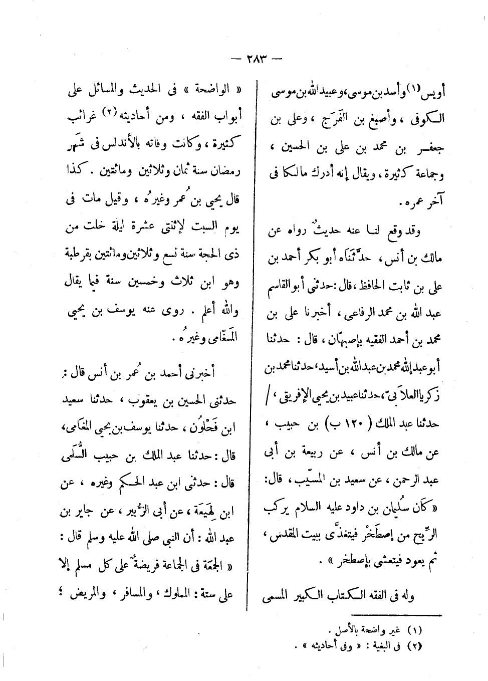 وله في الفقه الكتاب الكبير المسمى الواضحة في الحديث والمسائل علي أبواب الفقه، ومن أحاديثه غرائب كثيرة، وكانت وفاته بالأندلس في شهر رمضان سنة ثمان وثلاثين ومائتين. كذا قال يحيى بن عمر وغيره، وقيل مات في يوم السبت لأثنى عشرة ليلة خلت من ذي الحجة سنة تسع وثلاثين ومائتين بقرطبة، وهو ابن ثلاث وخمسين سنة فيما يقال والله أعلم. روى عنه يوسف بن يحيى المغامي وغيره.