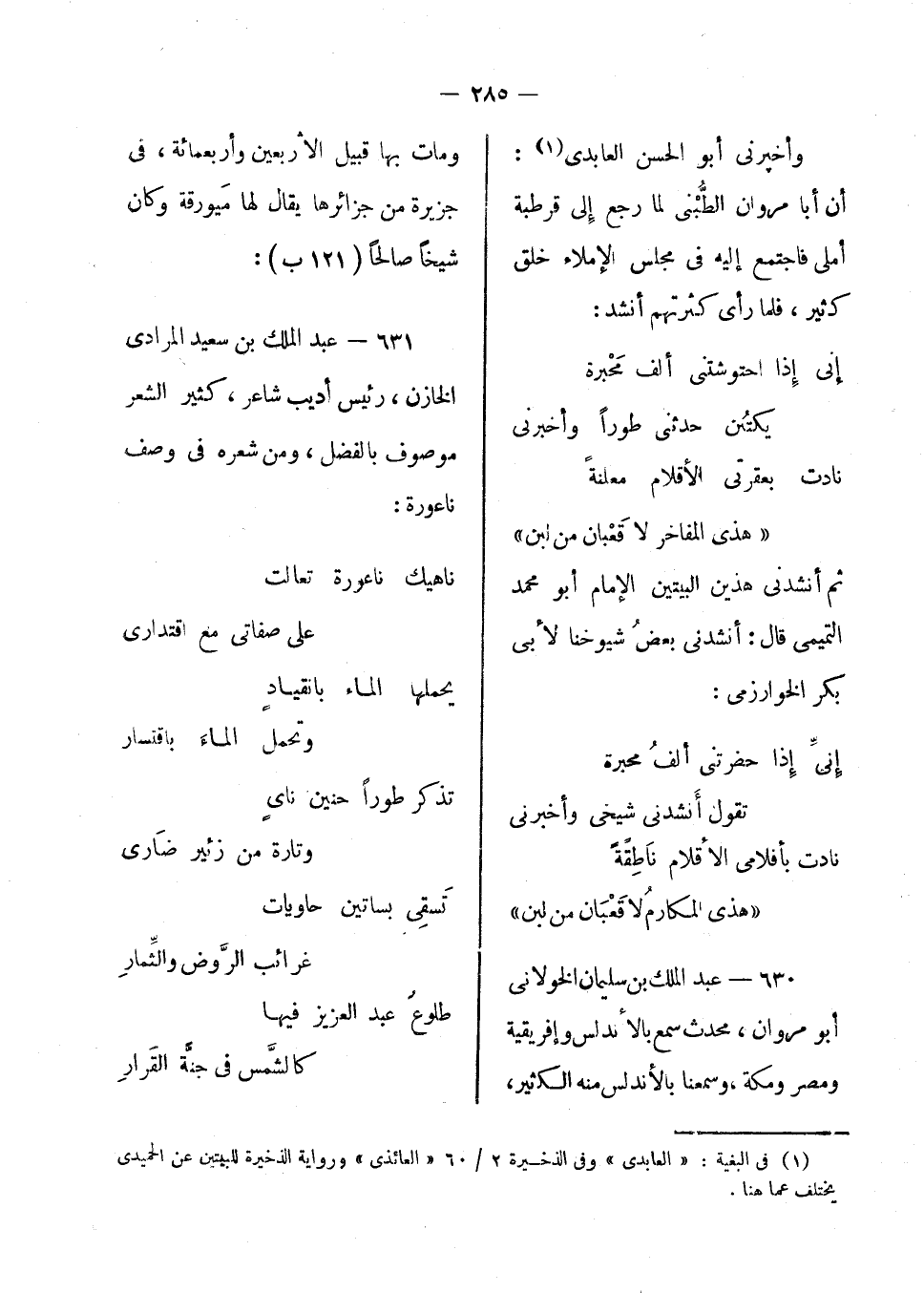 عبد الملك بن سليمان الخولاني أبو مروان، محدث سمع بالأندلس وإفريقية ومصر ومكة؛ وسمعنا بالأندلس منه الكثير، ومات بها قبيل الأربعين وأربع مائة، في جزيرة من جزائرها يقال لها ميورقة وكان شيخاً صالحاً عبد الملك بن سعيد المرادي الخازن، رئيس أديب شاعر، كثير الشعر موصوف بالفضل؛ ومن شعره في وصف ناعورة: