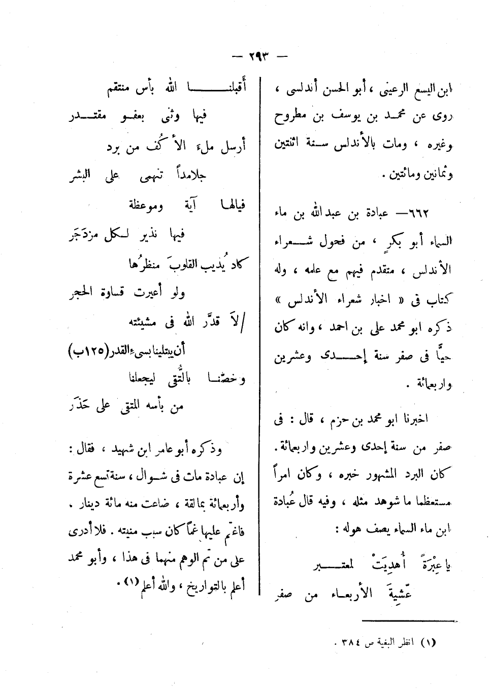 عبادة بن عبد الله بن ماء السماء أبو بكر، من فحول شعراء الأندلس، متقدم فيهم مع علمه، وله كتاب في أخبار شعراء الأندلس ذكره أبو محمد علي ابن أحمد، وأنه كان حياً في صفر سنة إحدى وعشرين وأربعمائة.