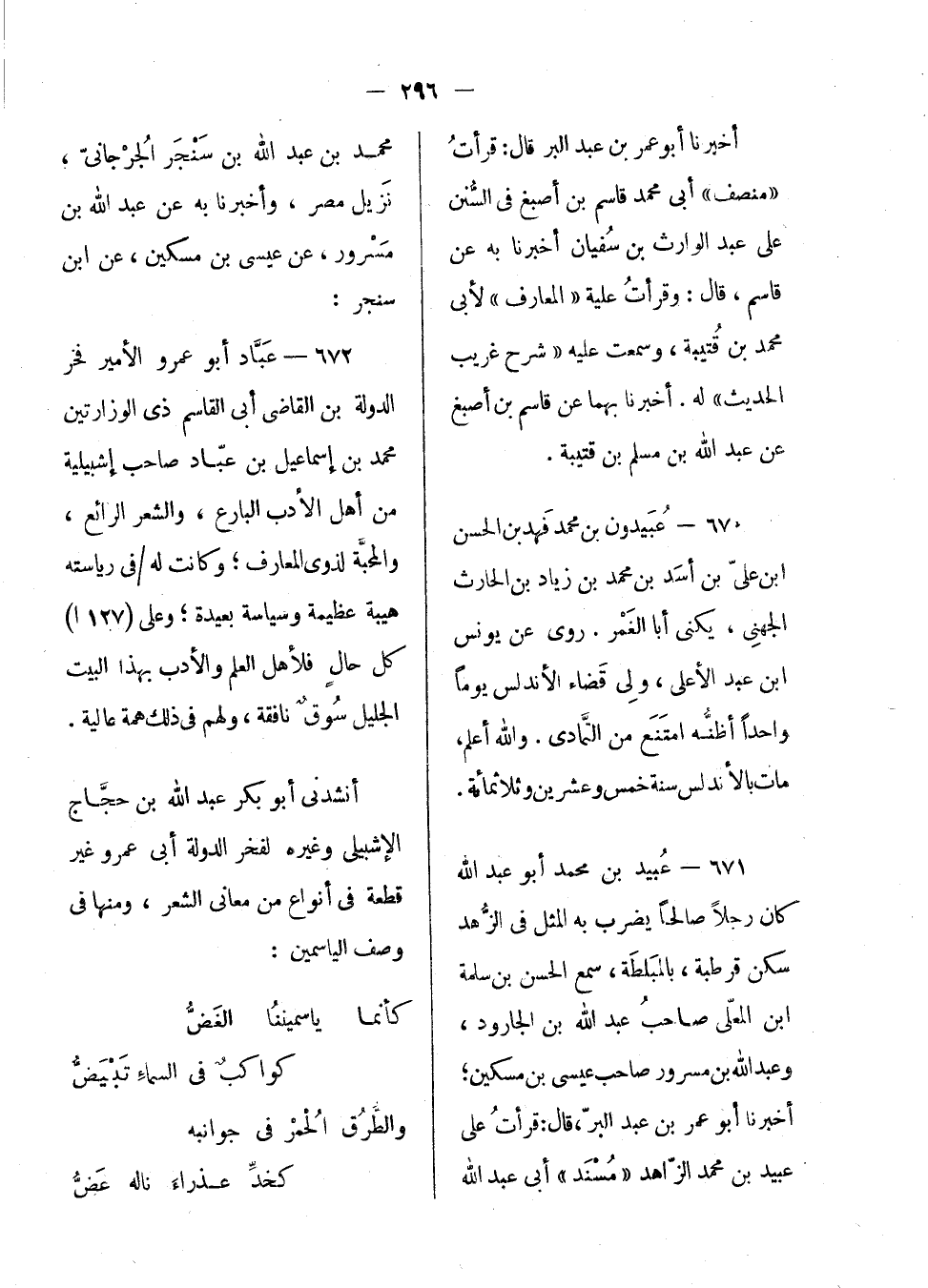 عبيد بن محمد أبو عبد الله كان رجلاً صالحاً يضرب به المثل في الزهد سكن قرطبة، بالمبلطة، سمع الحسن بن سلمة بن المعلى صاحب عبد الله بن الجارود، وعبد الله بن مسرور صاحب عيسى بن مسكين؛ أخبرنا أبو عمر بن عبد البر، قال: قرأت على عبيد بن محمد الزاهد مسند أبي عبد الله محمد بن عبد الله بن سنجر الجرجاني، نزيل مصر، وأخبرنا به عن عبد الله بن مسرور، عن عيسى بن مسكين، عن ابن سنجر: عباد أبو عمرو الأمير فخر الدولة ابن القاضي أبي القاسم ذي الوزارتين محمد بن إسماعيل بن عباد صاحب إشبيلية من أهل الأدب البارع، والشعر الرائع، والمحبة لذوي المعارف؛ وكانت له في رياسته هيبة عظيمة وسياسة بعيدة؛ وعلى كل حال فلأهل العلم والأدب بهذا البيت الجليل سوف نافقة، ولهم في ذلك همة عالية.