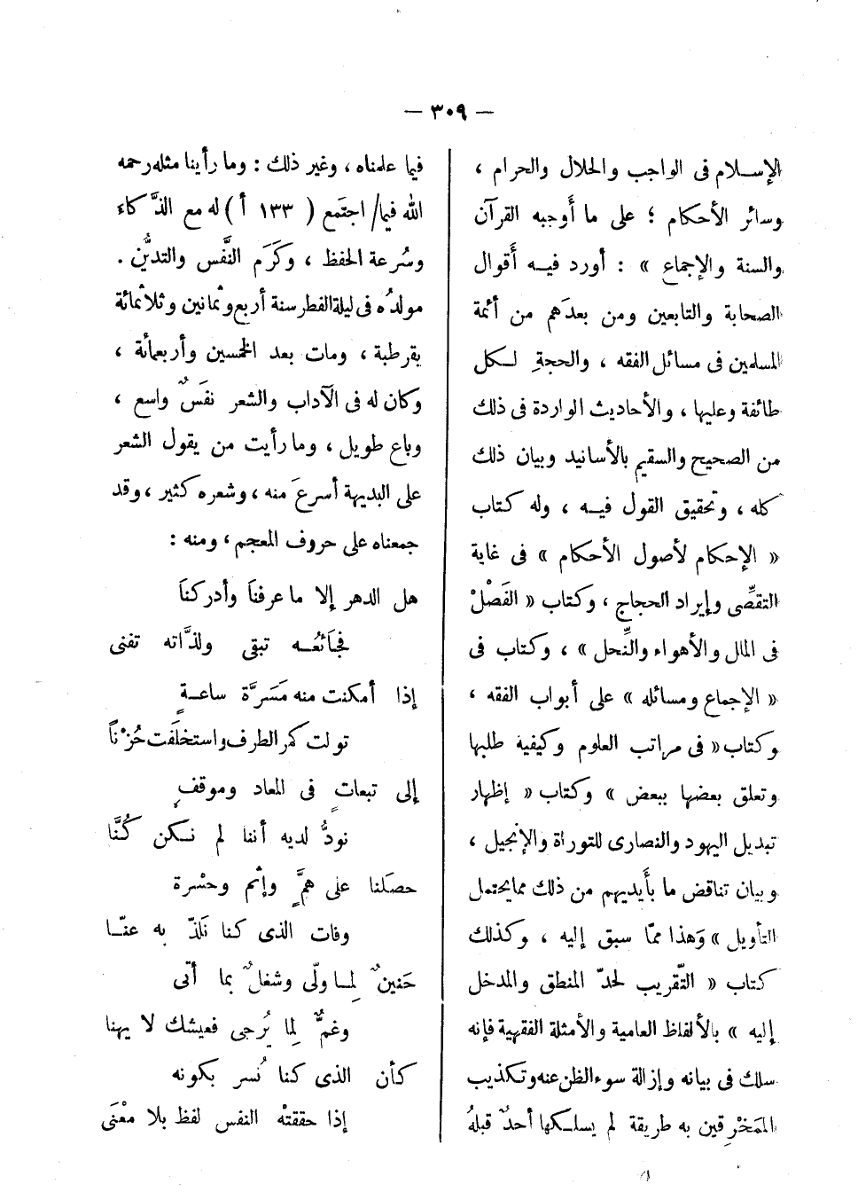 الإسلام في الواجب والحلال والحرام، وسائر الأحكام، على ما أوجبه القرآن والسنة والإجماع. أورد فيه أقوال الصحابة والتابعين ومن بعدهم من أئمة المسلمين في مسائل الفقه، والحجة لكل طائفة وعليها، والأحاديث الواردة في ذلك من الصحيح والسقيم بالأسانيد وبيان ذلك كله، وتحقيق القول فيه، وله كتاب الإحكام لأصول الأحكام في غاية النقصى وإيراد الحجاج؛ وكتاب الفصل في الملل وفي الأهواء والنحل، وكتاب في الإجماع ومسائله على أبواب الفقه، وكتاب في مراتب العلوم وكيفية طلبها وتعلق بعضها ببعض، وكتاب إظهار تبديل اليهود والنصارى للتوراة والإنجيل، وبيان تناقض ما بأيديهم من ذلك مما يحتمل التأويل. وهذا مما سبق إليه، وكذلك كتاب التقريب لحد المنطق والمدخل إليه بالألفاظ العامية والأمثلة الفقهية فإنه سلك في بيانه وإزالة سوء الظن عنه وتكذيب الممخرقين به طريقة لم يسلكها أحد قبله فيما علمناه، وغير ذلك. وما رأينا مثله رحمه الله فيما اجتمع له مع الذكاء وسرعة الحفظ، وكرم النفس والتدين؛ مولده في ليلة الفطر سنة أربع وثمانين وثلاث مائة بقرطبة، ومات بعد الخمسين وأربع مائة، وكان له في الآداب والشعر نفس واسع، وباع طويل، وما رأيت من يقول الشعر على البديهة أسرع منه، وشعره كثير، وقد جمعناه على حروف المعجم، ومنه: