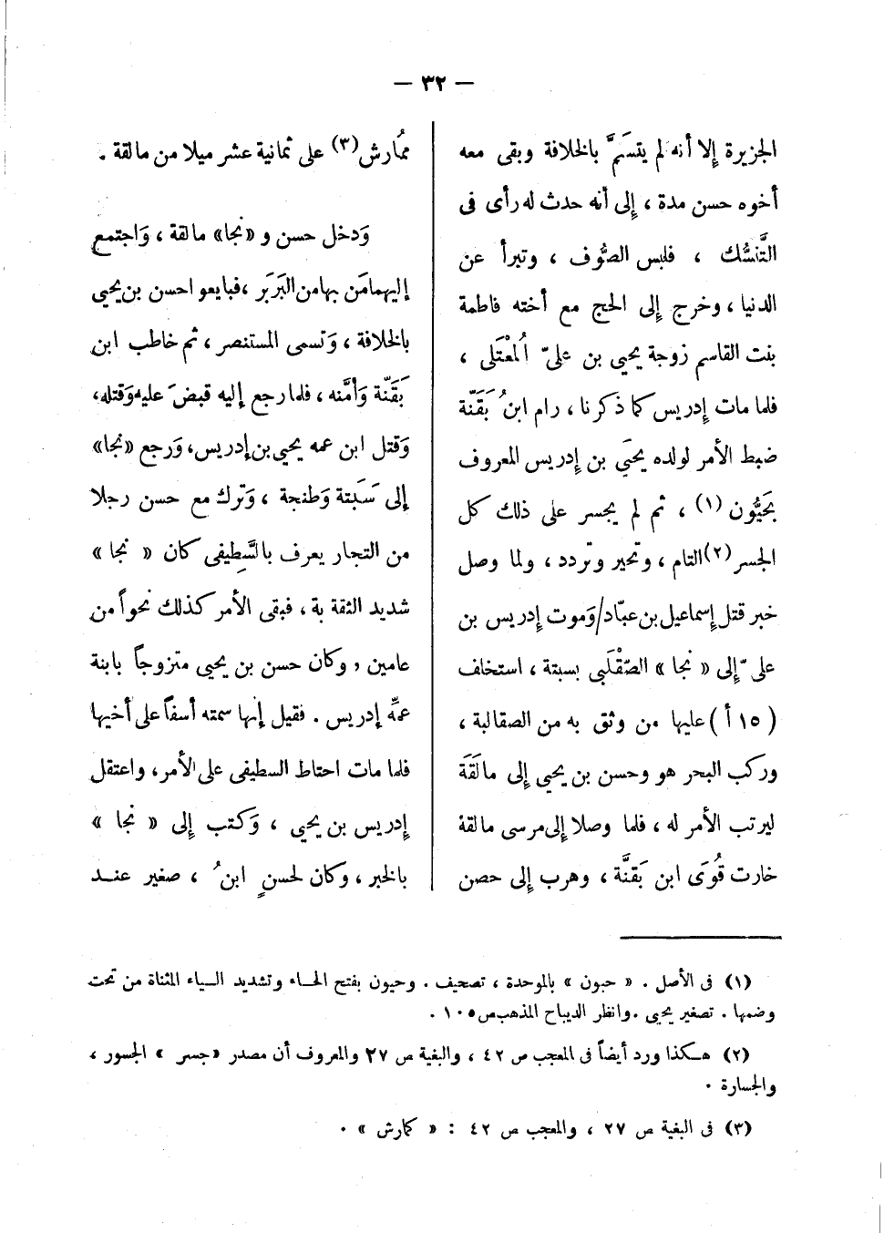 الجزيرة، إلا أنه بم يتسم بالخلافة، وبقي معه أخوه حسن مدة، إلى أنه حدث له رأى في التنسك، فلبس الصوف، وتبرأ عن الدنيا، وخرج إلى الحج مع أخته فاطمة بنت القاسم زوجة يحيى بن علي المعتلى، فلما مات إدريس كما ذكرنا، رام ابن بقنة ضبط الأمر لولده يحيى بن إدريس المعروف بحيون، ثم لم يجسر على ذلك الجسر التام، وتحير وتردد، ولما وصل خبر قتل إسماعيل بن عباد وموت إدريس بن علي إلى نجا الصقلبي بسبتة، استخلف عليها من وثق به من الصقالبة، وركب البحر هو وحسن بن يحيى إلى مالقة ليرتب الأمر له، فلما وصلا إلى موسى مالقة خارت قوى ابن بقنة، وهرب إلى حصن ممارش على تمانية عشر ميلا من مالقة.