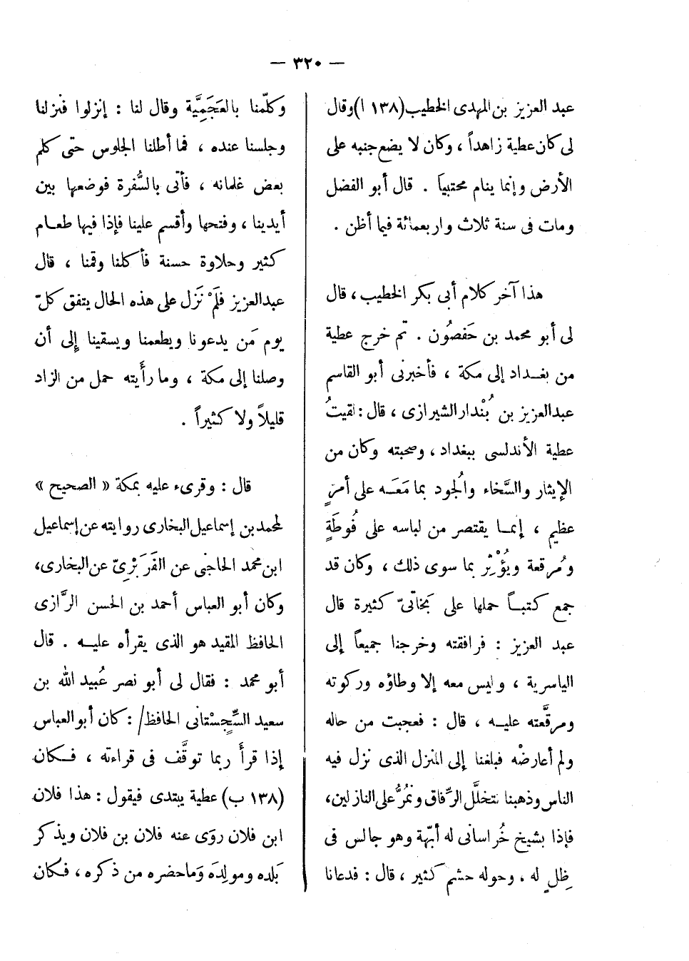 قال: وقرىء عليه بمكة الصحيح لمحمد بن إسماعيل البخاري روايته عن إسماعيل ابن محمد الحاجبي عن الفربري عن البخاري، وكان أبو العباس أحمد بن الحسن الرازي الحافظ المقيد هو الذي يقرأه عليه. قال أبو محمد: فقال لي أبو نصر عبيد الله بن سعيد السجستاني الحافظ: كان أبو العباس إذا قرأ ربما توقف في قراءته، فكان عطية يبتدى فيقول: هذا فلان بن فلان روى عنه فلان بن فلان ويذكر بلده ومولده وما حضره من ذكره، فكان