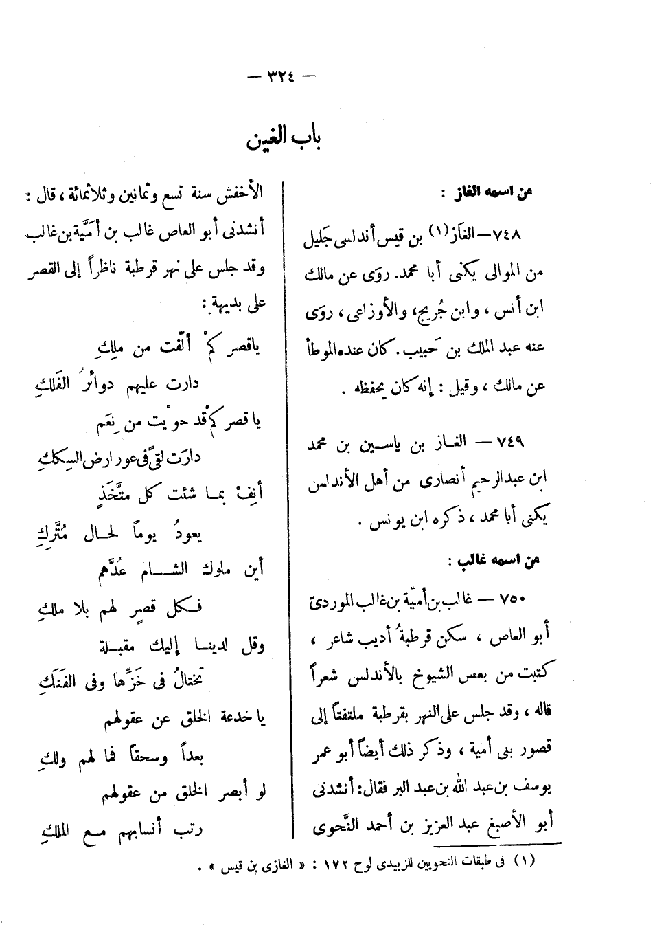 غالب بن أمية بن غالب الموروري أبو العاص، سكن قرطبة أديب شاعر، كتبت من بعض الشيوخ بالأندلس شعراً قاله، وقد جلس على النهر بقرطبة ملتفتاً إلى قصور بني أمية، وذكر ذلك أيضاً أبو عمر يوسف بن عبد الله بن عبد البر فقال: أنشدني أبو الأصبغ عبد العزيز بن أحمد النحوي الأخفش سنة تسع وثمانين وثلثمائة، قال: أنشدني أبو العاص غالب بن أمية بن غالب وقد جلس على نهر قرطبة ناظراً إلى القصر على بديهة: