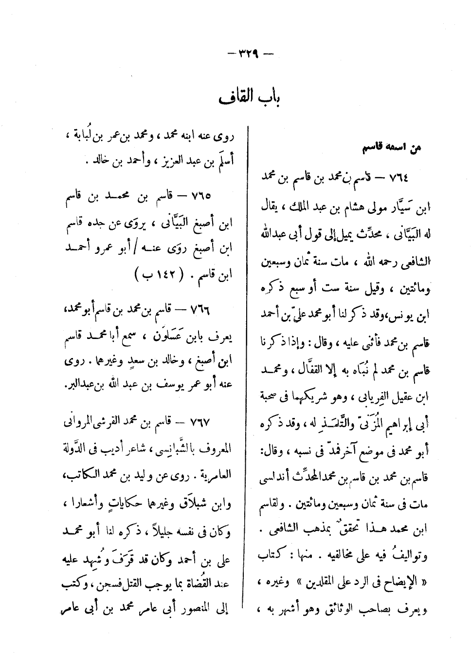 قاسم بن محمد بن قاسم بن محمد بن سيار مولى هشام بن عبد الملك، يقال له البياني، محدث يميل إلى قول أبي عبد الله الشافعي رحمه الله، مات سنة ثمان وسبعين ومائتين، وقيل سنة ست أو سبع ذكره ابن يونس، وقد ذكر لنا أبو محمد علي بن أحمد قاسم بن محمد فأثنى عليه، وقال: وإذا ذكرنا قاسم بن محمد لم نباه به إلا القفال، ومحمد بن عقيل الفريابي، وهو شريكهما في صحبة أبي إبراهيم المزني والتلمذ له، وقد ذكره أبو محمد في موضع آخر فمد في نسبه، وقال: قاسم بن محمد بن قاسم بن محمد المحدث أندلسي، مات في سنة ثمان وسبعين ومائتين. ولقاسم بن محمد هذا تحقق بمذهب الشافعي. وتواليف فيه على مخالفته. منها: كتاب الإيضاح في الرد على المقلدين وغيره، ويعرف بصاحب الوثائق وهو أشهر به، روى عنه ابنه محمد، ومحمد بن عمر ابن لبابة، وأسلم بن عبد العزيز، وأحمد بن خالد.