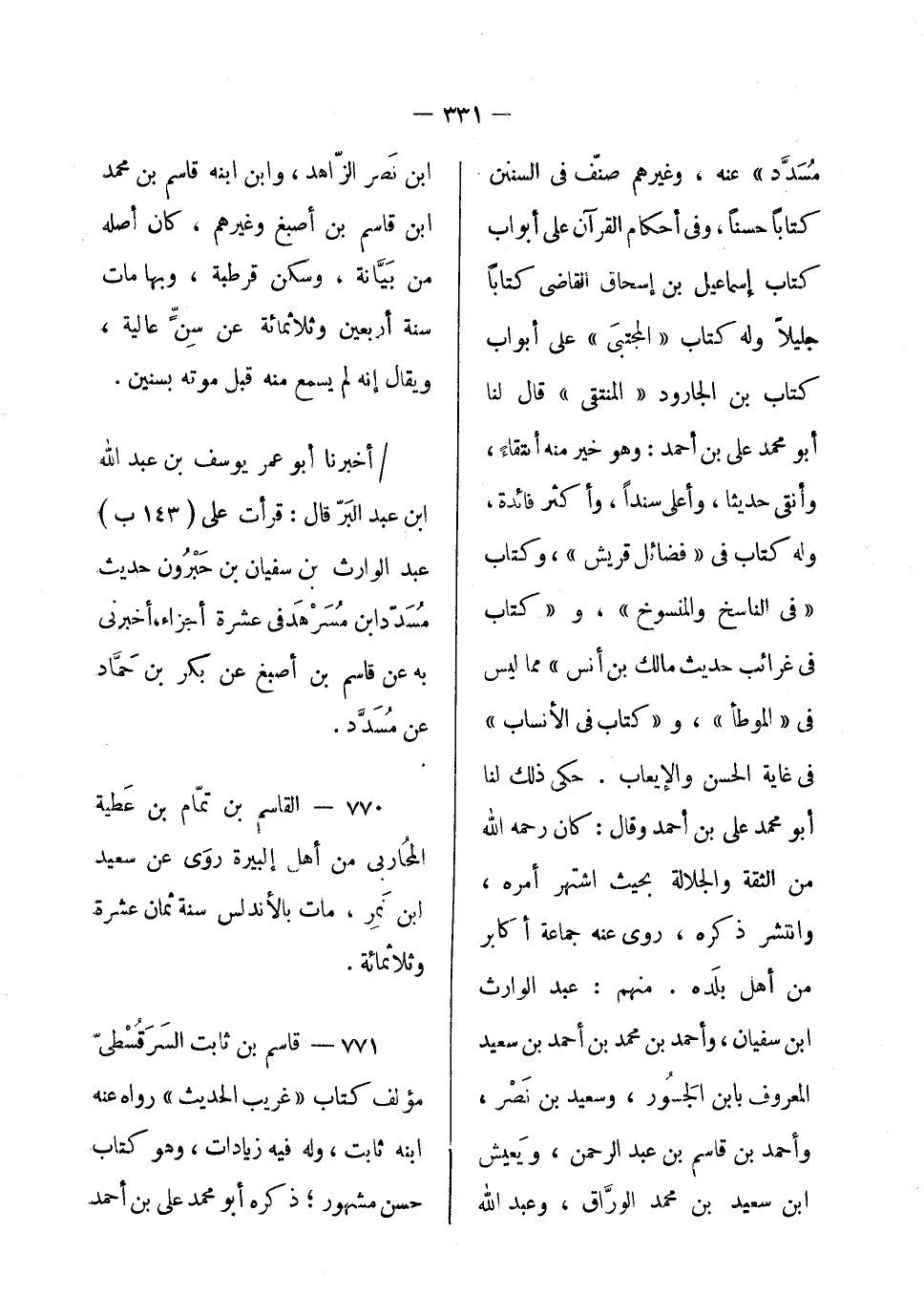 مسدد عنه، وغيرهم صنف في السنن كتاباً حسناً، وفي أحكام القرآن على أبواب كتاب إسماعيل بن إسحاق القاضي كتاباً حسناً، وفي أحكام القرآن على أبواب كتاب إسماعيل بن إسحاق القاضي كتاباً جليلاً وله كتاب المجتبي على أبواب كتاب ابن الجارود المنتقى قال لنا أبو محمد علي بن أحمد: وهو عير منه انتقاء، وأبقى حديثا، وأعلى سنداً، وأكثر فائدة، وله كتاب في فضائل قريش، وكتاب في الناسخ والمنسوخ، وكتاب في غرائب حديث مالك بن أنس مما ليس في الموطأ، وكتاب في الأنساب في غاية الحسن والإيعاب. حكى ذلك لنا أبو محمد علي بن أحمد وقال: كان رحمه الله من الثقة والجلالة بحيث اشتهر أمره، وانتشر ذكره، روى عنه جماعة أكابر من أهل بلده. منهم: عبد الوارث بن سفيان، وأحمد بن محمد بن أحمد بن سعيد المعروف بابن الجسور، وسعيد بن نصر، وأحمد بن قاسم بن عبد الرحمن، ويعيش ابن سعيد بن محمد الوراق، وعبد الله بن نصر الزاهد، وابن ابنه قاسم بن محمد وابن قاسم بن أصبغ وغيرهم، كان أصله من بيانة، وسكن قرطبة، وبهامات سنة أربعين وثلاث مائة عن سن عالية، ويقال إنه لم يسمع منه قبل موته بسنين.