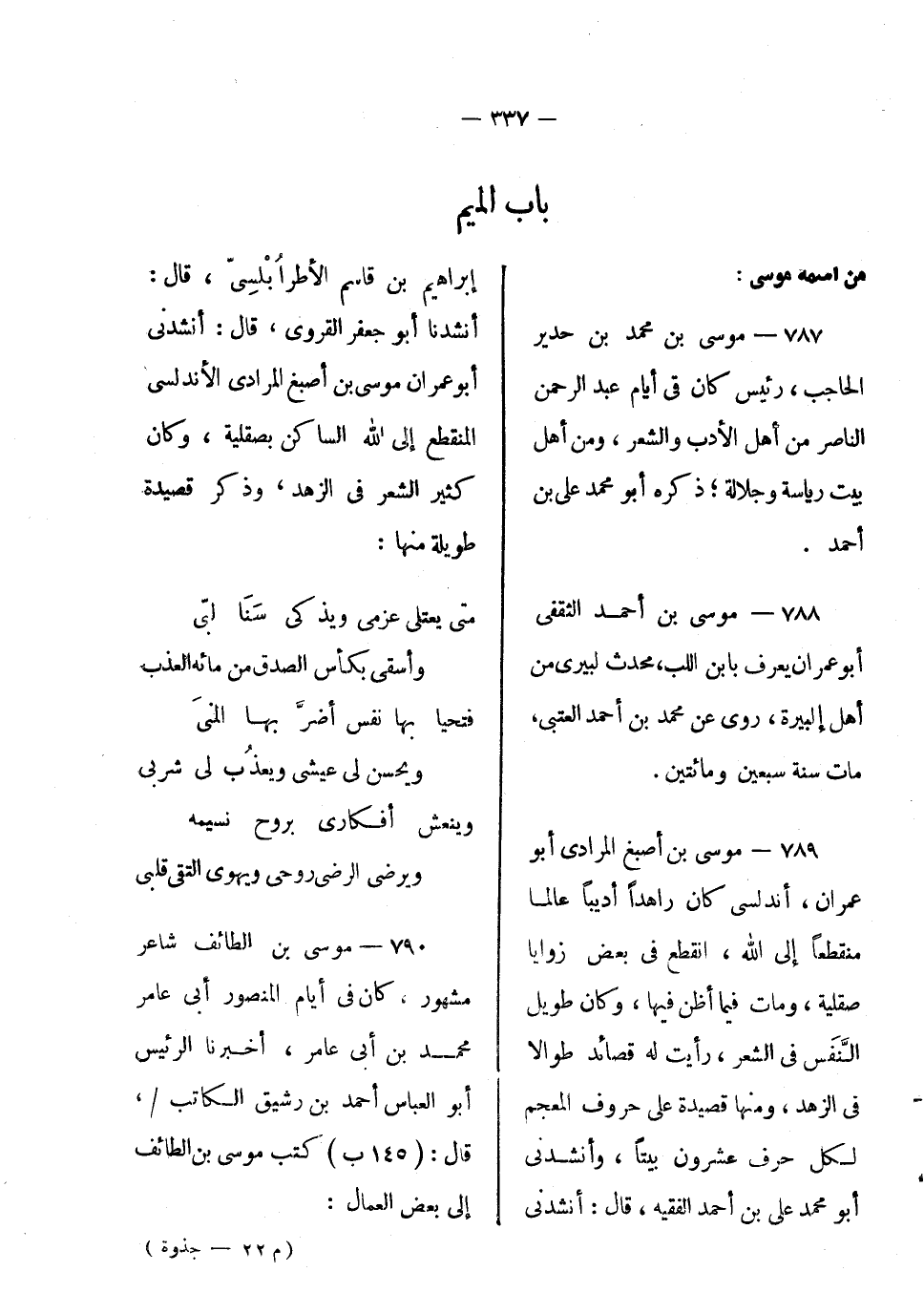 موسى بن أصبغ المرادي أبو عمران، أندلسي كان زاهداً أديباً عالما منقطعاً إلى الله، انقطع في بعض زوايا صقلية، ومات فيما أظن فيها، وكان طويل النفس في الشعر، رأيت له قصائد طوالاً في الزهد، ومنها قصيدة على حروف المعجم لكل حرف عشرون بيتاً، وأنشدني أبو محمد علي بن أحمد الفقيه، قال: أنشدني إبراهيم بن قاسم الأطرابلسي، قال: أنشدنا أبو جعفر القروي، قال: أنشدني أبو عمران موسى بن أصبغ المرادي الأندلسي المنقطع إلى الله الساكن بصقلية، وكان كثير الشعر في الزهد، وذكر قصيدة طويلة منها: