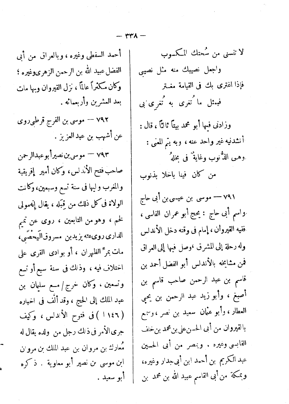موسى بن نصير أبو عبد الرحمن صاحب فتح الأندلس، وكان أمير إفريقية والمغرب وليها في سنة تسع وسبعين، وكانت الولاة في كل ذلك من قبله، يقال إنه مولى لخم، وهو من التابعين، روى عن تميم الداري روى عنه يزيد بن مسروق اليحصبي، مات بمر الظهران، أو بوادي القرى على اختلاف فيه، وذلك في سنة سبع أو تسع وتسعين، وكان خرج مع سليمان بن عبد الملك إلى الحج، وقد ألف في أخباره في فتوح الأندلس، وكيف جرى الأمر في ذلك رجل من ولده يقال له معارك بن مروان بن عبد الملك بن مروان بن موسى بن نصيراً أبو معاوية. ذكره أبو سعيد.